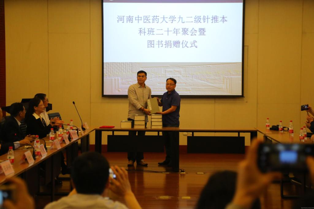 接下来,时任92级针推本科班辅导员的学工部刘金厂部长发言。他看到昔日的弟子们,20多年前的往事一幕幕在眼前浮现。刘部长和同学们一起回忆起当年的点点滴滴,大家仿佛又重回青春年少时,浓厚的师生情、同窗谊跨越了时间的藩篱,萦绕在大家心间。当年曾给校友们授课的路玫院长、邵素菊老师等随后发言。老师们深情地对同学们说,一日为师,终身为父,愿意永远做同学们的良师益友,在人生的道路上风雨兼程,一路相伴,并向同学们赠送了《河南省当代特色针灸技术集萃》、《圣心仁术-针灸大师邵经明》等书籍。