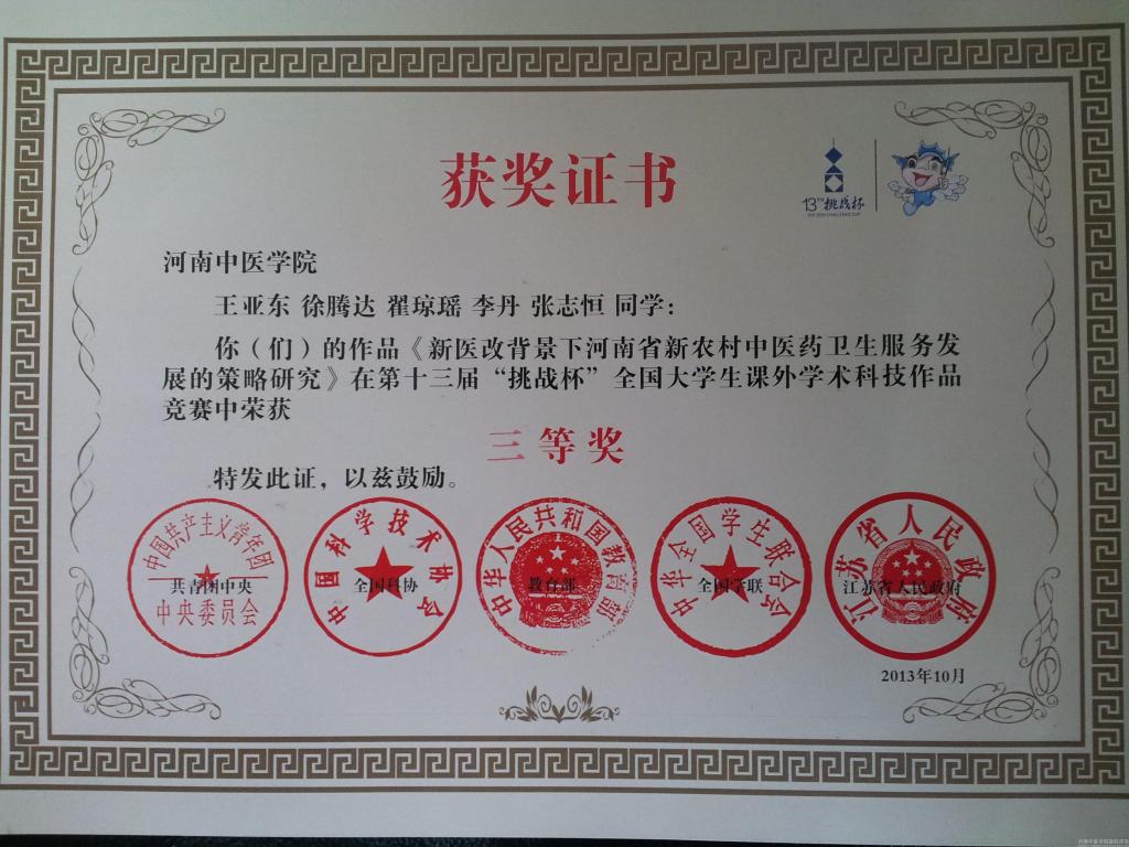 “挑战杯”竞赛始终与时代脉搏同频共振,与国家战略紧密契合,与青年成长成才密切相连。本届共有来自全国454所高校的1136件作品入围,我省共11所高校的50件作品参加终审决赛,最终36件作品获奖。leyu·乐鱼(中国)体育官方网站基础医学院大学生王亚东等的《新医改背景下河南省新农村中医药卫生服务发展的策略研究》和第二临床医学院大学生翟优等的《医学生人文医学执业技能培养模式研究》两件作品都获得国赛三等奖,其中翟优的纸质作品参加了现场展示,王亚东的作品进行了现场封闭问辩。评审团评委对leyu·乐鱼(中国)体育官方网站作品给予高度评价,认为leyu·乐鱼(中国)体育官方网站作品结合了当前社会热点问题,作品本身比较完整,调查数据详实,对当前新医改背景下新农村中医药卫生服务发展的研究具有较大贡献。