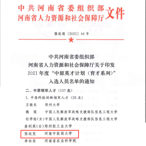 本网讯(文图/闫晓)近日,中共河南省委组织部、河南省人力资源和社会保障厅联合发文,公布了2021年度“中原英才计划(育才系列)”入选人员名单,康复医学院党委书记张运克教授入选“中原英才计划-科技创新领军人才”。