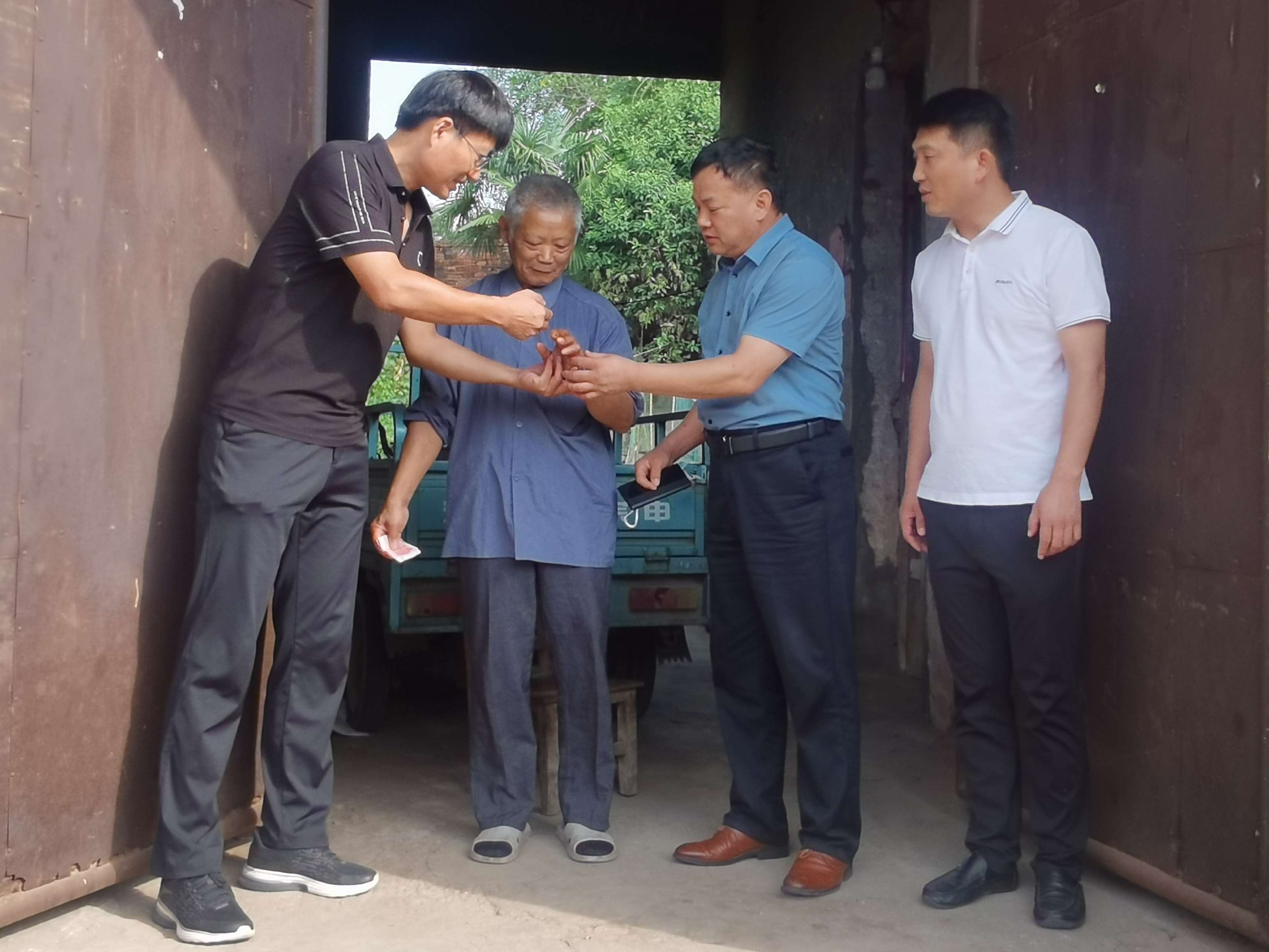 蔡庆春与乡村两委及驻村队员进行了亲切座谈,并代表医院党委对驻村工作取得的成绩表示祝贺,对乡村两级对驻村工作队的关心、支持表示感谢。他说,在中秋佳节即将到来之际,医院党政领导心系皮冲村驻村干部,驻村工作队员舍小家为大家,扎根基层,无私奉献的精神值得全体教职工学习,相信在大家的共同努力下,一定会以优异的成绩圆满完成组织交给的任务,助力皮冲村走上振兴之路。随后,他慰问了意外受伤,手指截肢的建档立卡脱贫五保户陈金保,转达了医院党委对基层群众的关心,并送上慰问金。