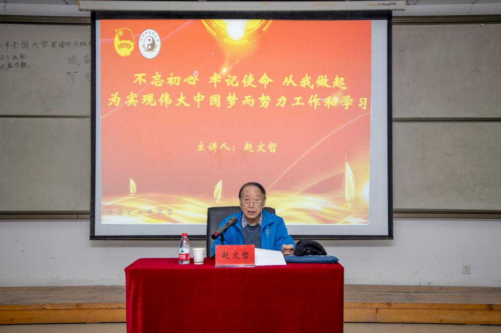 讲座围绕“中国共产党的初心和使命是什么”“中国共产党的先辈们为了实现初心和使命同敌人顽强斗争付出的巨大的流血牺牲”“解放后各路英雄不忘初心、牢记使命不断创造奇迹”“我们这一代人应当传承红色基因听党话跟党走学好本领报效祖国”四个部分展开。赵文哲结合大量史实,带领大家回顾了中国共产党成立的背景以及中国共产党的先辈们为革命而付出的牺牲;结合自己的亲身经历,深入浅出、生动形象地描述了在中国共产党的领导下,我们国家取得的辉煌成就。他指出,中国梦是历史的也是现实的,伟大的中国梦终将在一代与一代青年人的接力奋斗中变为现实。希望广大青年学生:一是传承红色基因,不忘老一辈的艰苦奋斗,听党话,跟党走,高举党的旗帜,继续砥砺前行;二是在业务上,学好知识,掌握好技能,做一个好学生,将来做一个好医生,为继承、发掘、发展中医药事业做出自己的努力,为中医药走向世界做出自己的贡献。
