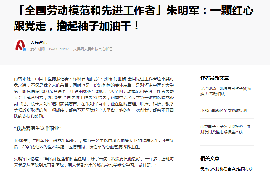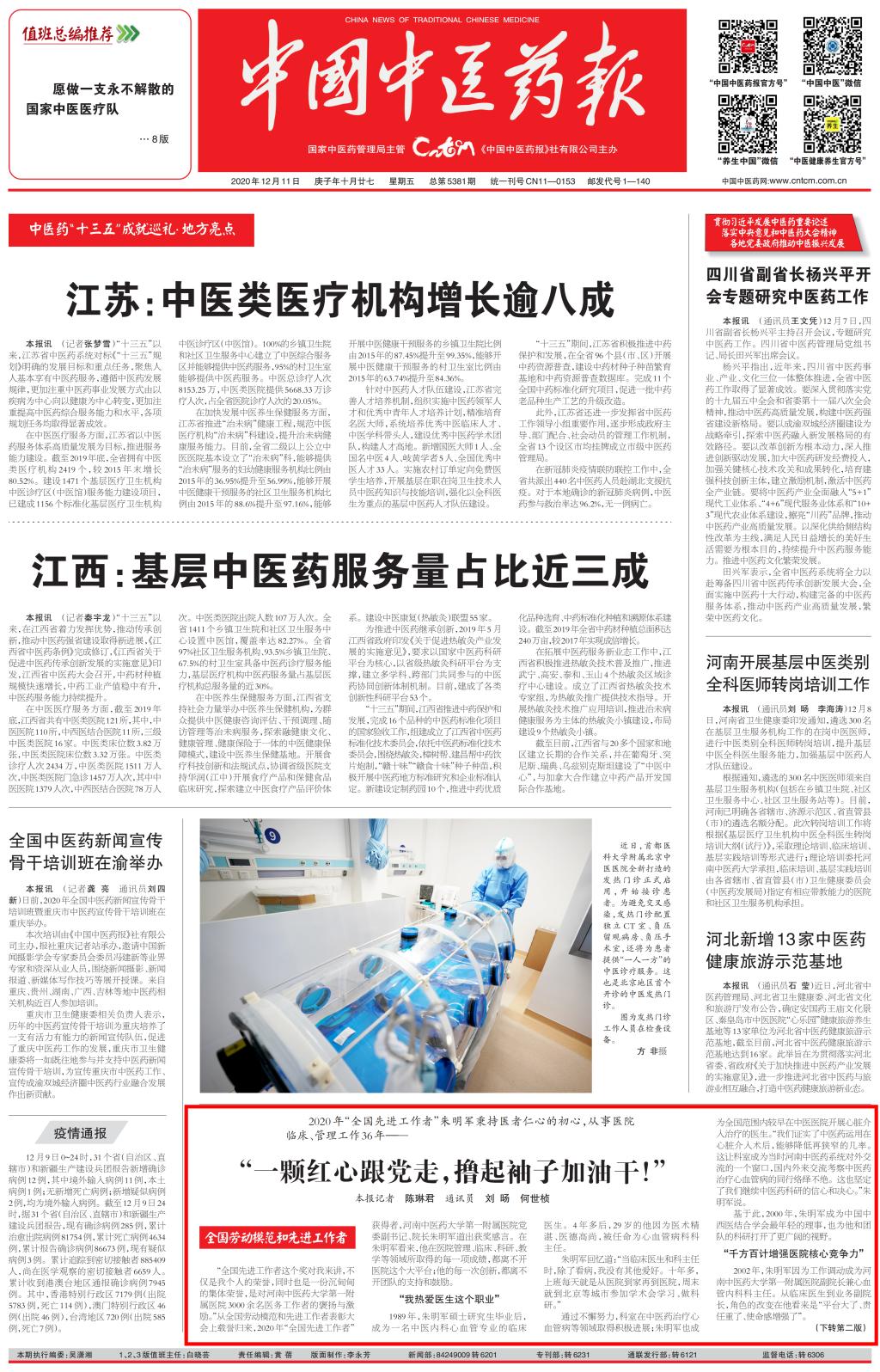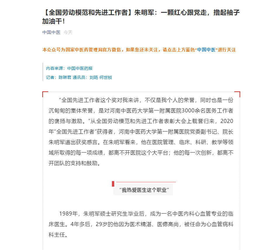 编者按:2020年12月11日,中国中医药报、人民资讯、国家中医药管理局官方微信等媒体对全国先进工作者、leyu·乐鱼(中国)体育官方网站一附院院长朱明军一颗红心跟党走,撸起袖子加油干的事迹进行报道。