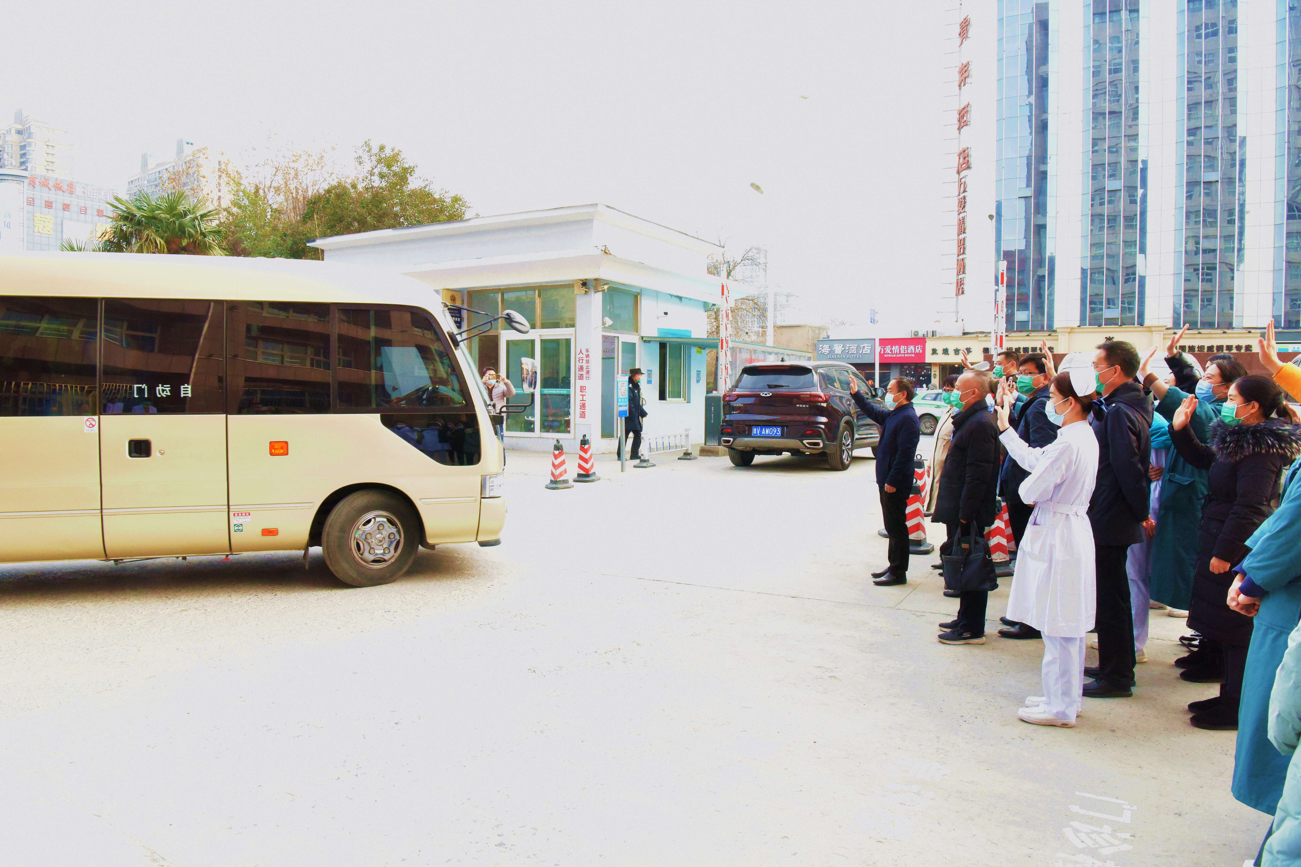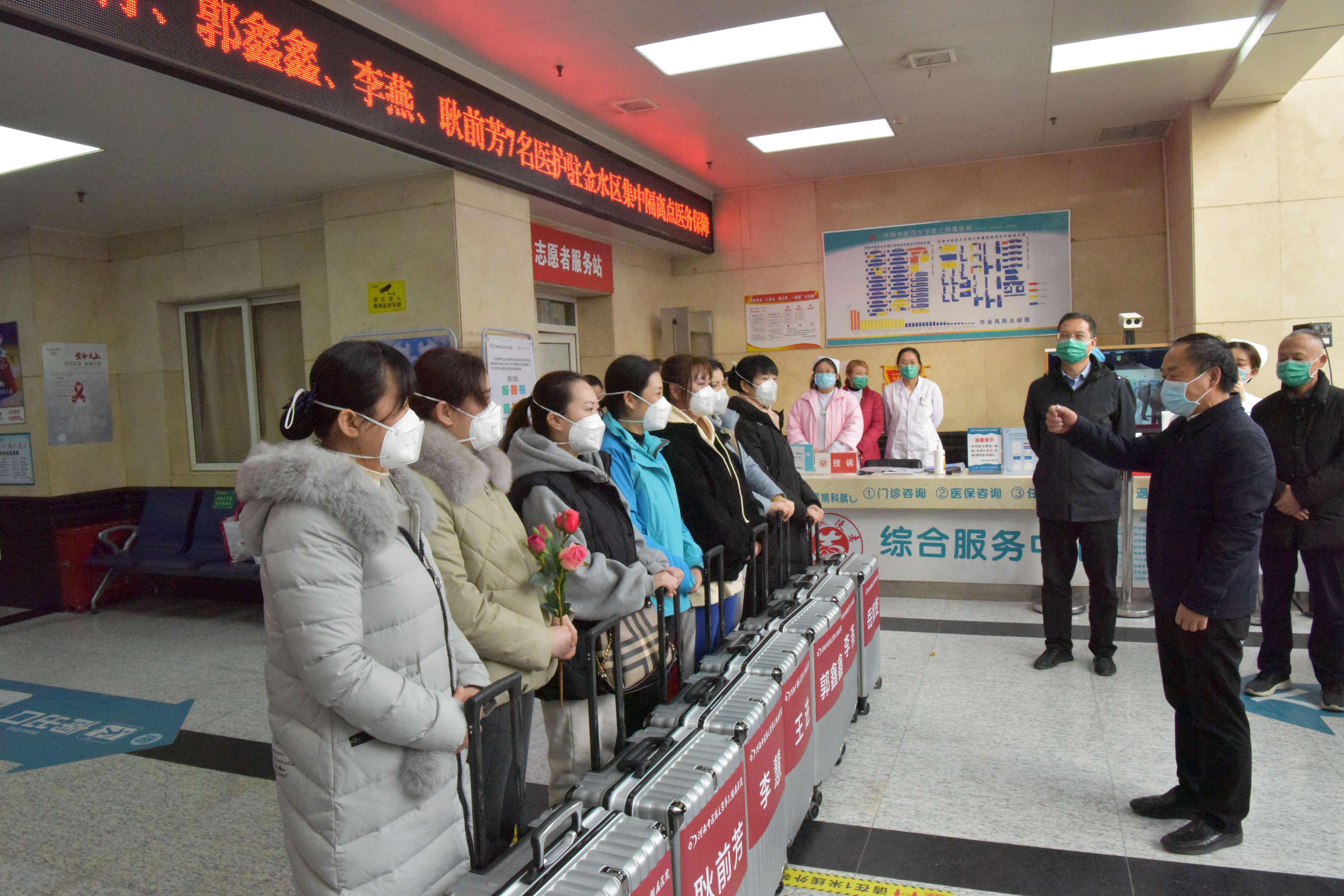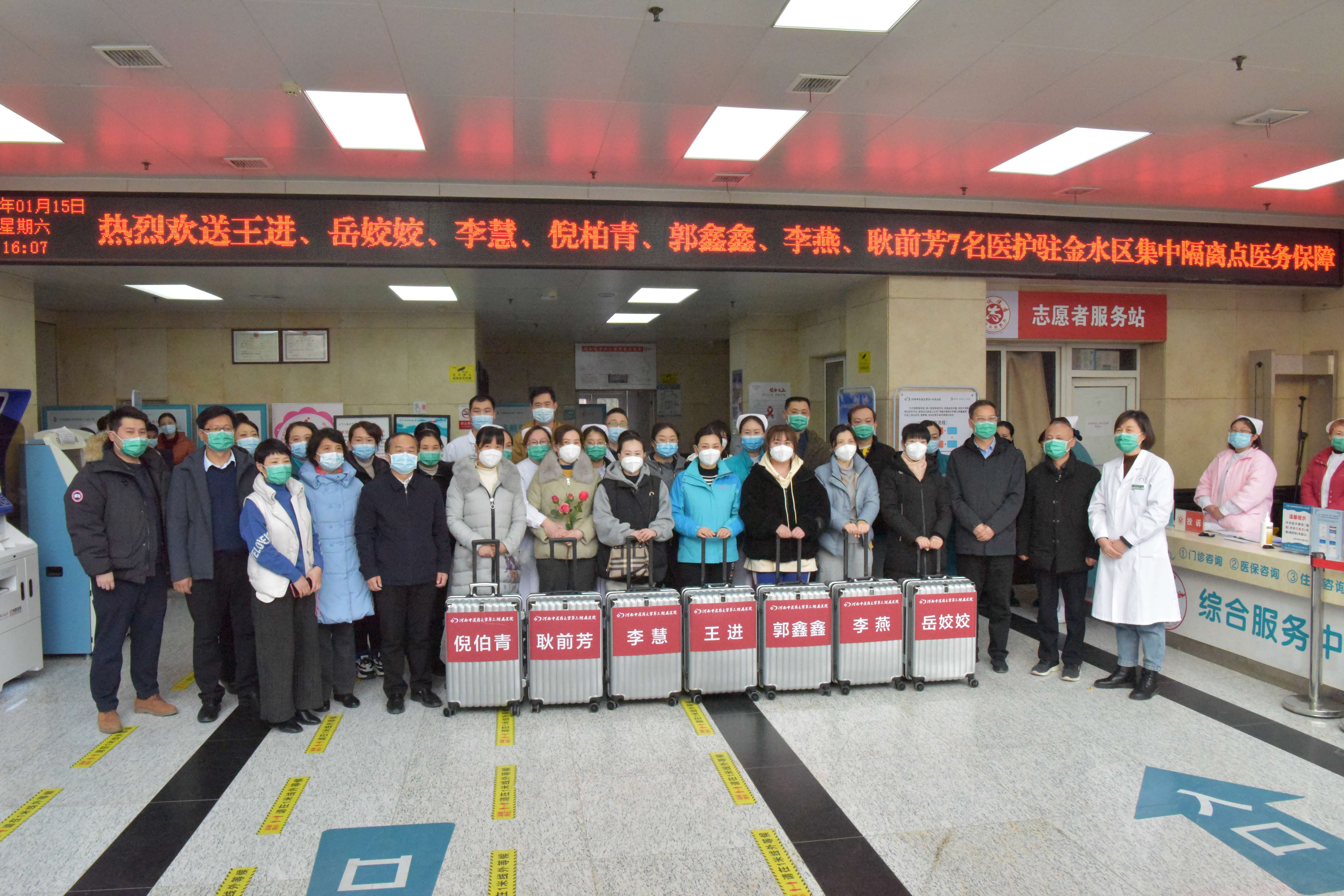 2022年1月15日下午4:00,三附院7名医护人员进驻金水区集中隔离点执行医务保障任务。院党委书记周运峰,党委委员、副院长王志超、高翔和相关部门负责人、派出科室医务人员欢送医疗队员。