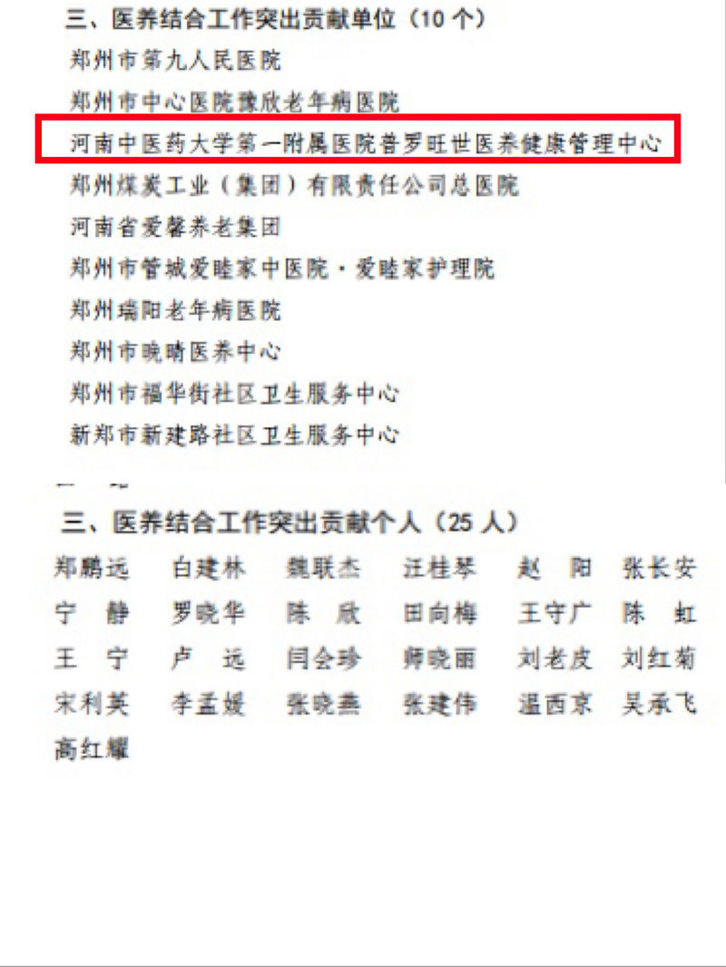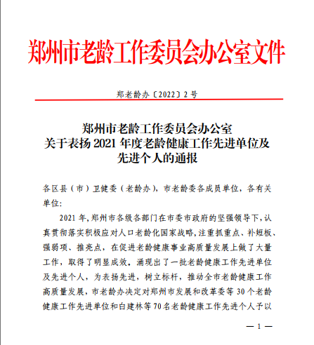 本网讯(文图/梁楠)近日,郑州市老龄工作委员会办公室下发了《关于表扬2021年度老龄健康工作先进单位和先进个人的通知》,一附院普罗旺世健康管理中心荣获2021年度“医养结合工作突出贡献”单位,来自普罗旺世健康管理中心的魏联杰和陈欣荣获“突出贡献个人”称号。
