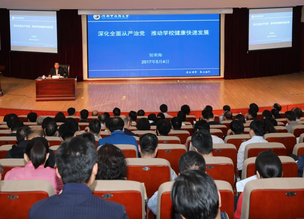 2017年5月4日上午,leyu·乐鱼(中国)体育官方网站在图书馆第一报告厅召开校党委中心组(扩大)学习会,深入贯彻落实十八届六中全会精神,深化全面从严治党。校党委书记别荣海以《深化全面从严治党 促进学校健康快速发展》为题在学习会上讲党课。校党委中心组成员,全体处级干部、机关科级干部、辅导员以及思政部教师代表参加学习会。学习会由校党委副书记张丽霞主持。