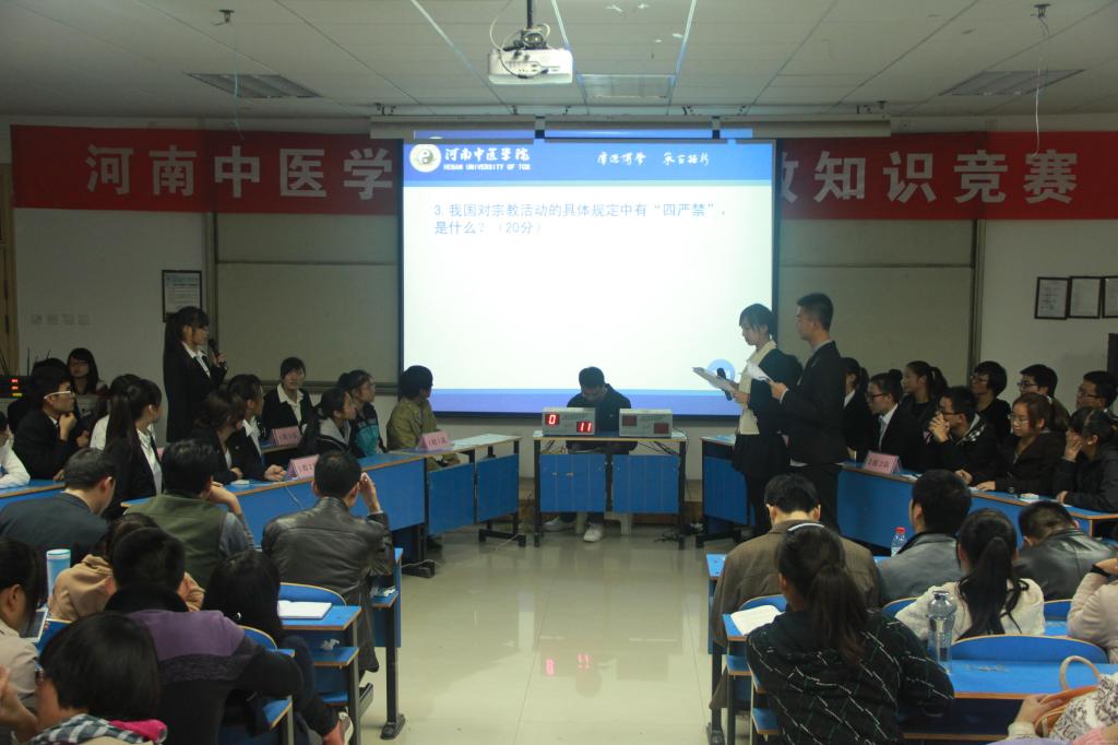 2013年10月31日晚,党委宣传统战部和学工部联合举办了大学生宗教知识竞赛决赛。研究生代表队、第一临床医学院代表队等九队选手展开了激烈的比赛。党委宣传统战部、学工部负责人等担任竞赛仲裁评委。二级院系的学工人员及300余名学生观看了比赛。