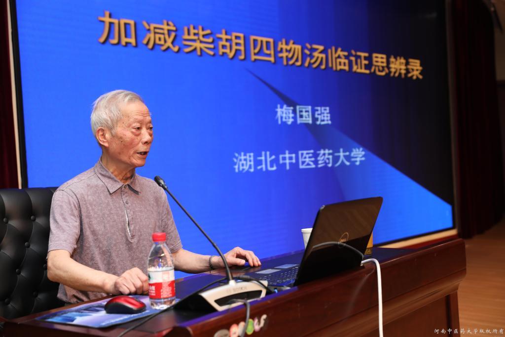 在2017年6月18日上午,在中华中医药学会仲景学术传承与创新联盟成立后设立的仲景学术传承与创新论坛上,湖北中医药大学教授,国医大师梅国强作了一场题为“柴胡四物汤临证思辨录”的学术报告。他在学术报告中指出,小柴胡汤见于《伤寒论》太阳篇第96条,梅教授概括其功效为:本方寒温并用,攻补兼施,升降协调,外证得之,重在和解少阳,疏散邪热,内证得之,还有疏利三焦,调达上下,宣通内外,运转枢机之效。四物汤出自唐·蔺道人《仙授理伤续断秘方》,柴胡四物汤见于刘完素《素问病机气宜保命集·妇人胎产论》中,梅教授围绕着柴胡四物汤疏导肝胆、养血理血,以治头面疼痛;调达肝木、凉血活血,以治耳鸣脑鸣;和解枢机、凉血活血,以治胸肋痛;和解枢机、养血活血,以治皮肤病等七点临床体会,并结合临床病例,旁征博引,环环相扣,严谨而细致地向大家展现了经方的魅力。