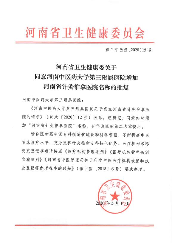 本网讯(文/李志刚)2020年5月14日,河南省卫生健康委发布《河南省卫生健康委关于同意leyu·乐鱼(中国)体育官方网站第三附属医院增加河南省针灸推拿医院名称的批复》(豫卫中医函〔2020〕15号),三附院获批“河南省针灸推拿医院”名称。河南省针灸推拿医院成为全国首家省级针灸推拿医院。