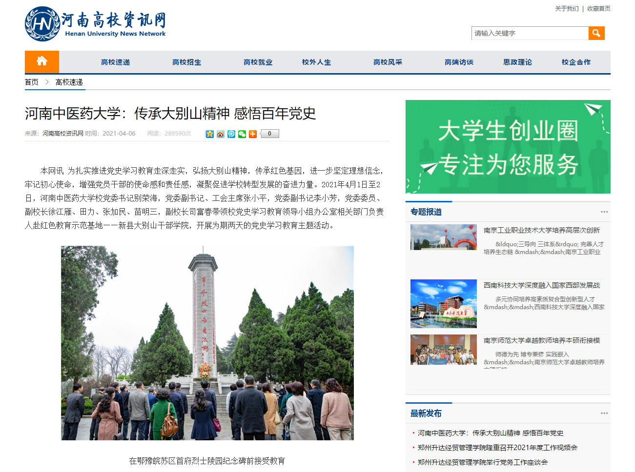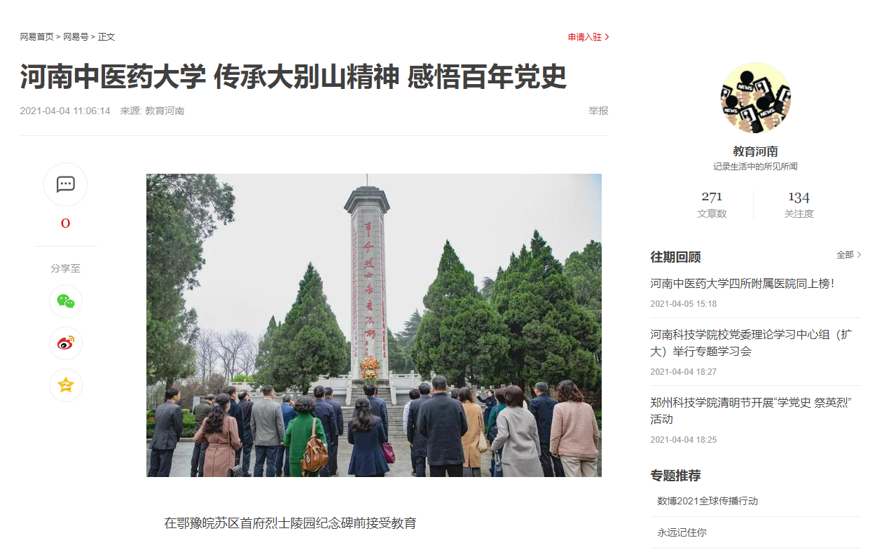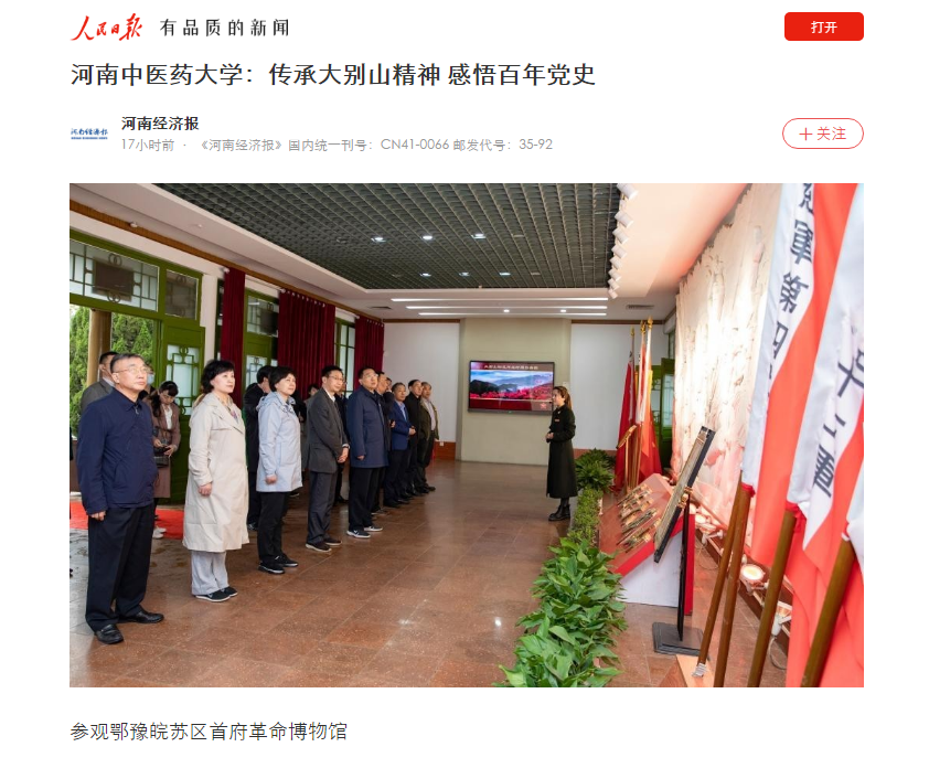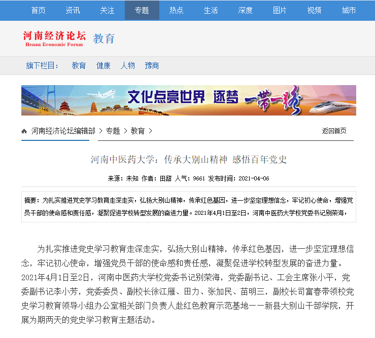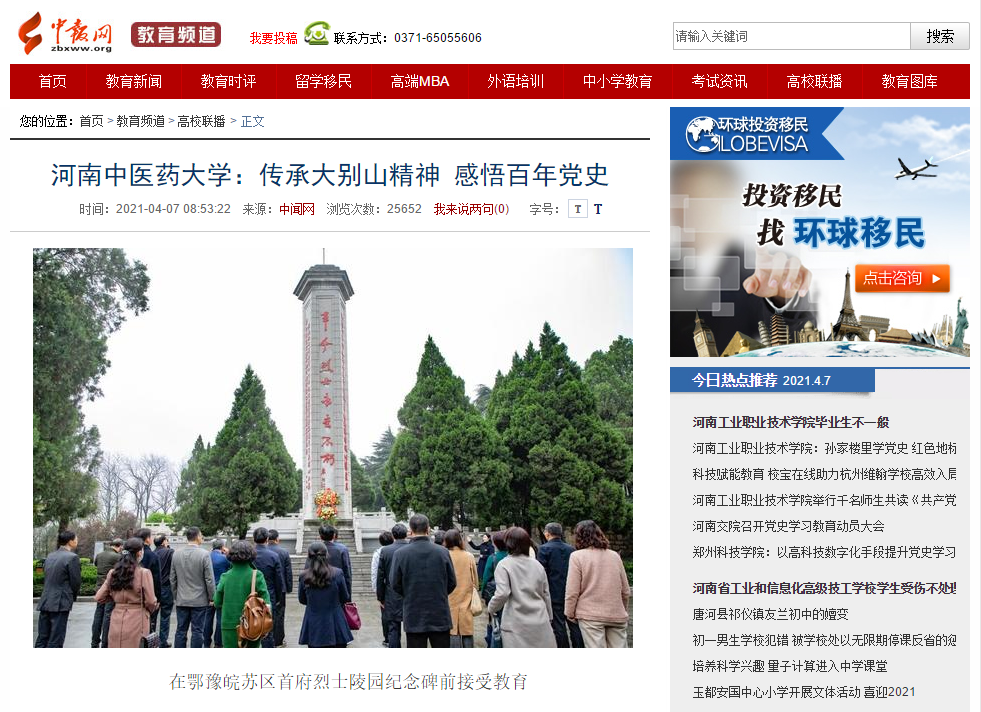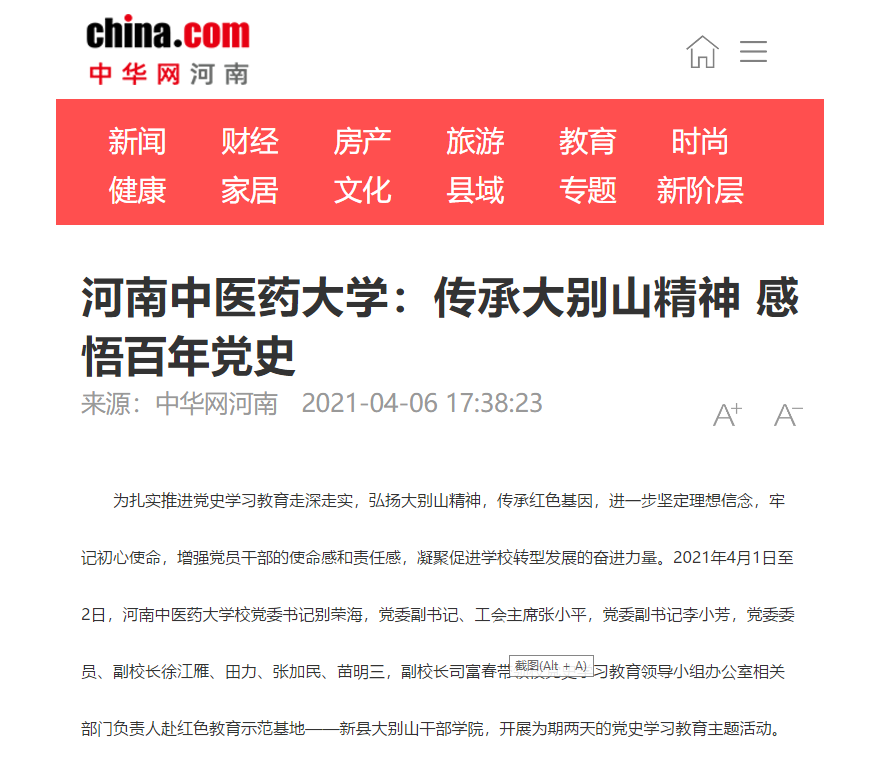 编者按:2021年4月6日-7日,人民日报海外网、人民日报客户端、中国网、中华网、中国教育网、中报网、中闻网、中新资讯网、中华高校网、大河网、顶端新闻、河南教育周刊、中原经济网、河南经济论坛、新豫网、中原网、河南高校资讯网、网易新闻等数十家媒体以《leyu·乐鱼(中国)体育官方网站:传承大别山精神 感悟百年党史》为题,对leyu·乐鱼(中国)体育官方网站党委理论学习中心组赴新县扎实开展党史学习教育进行了广泛报道。