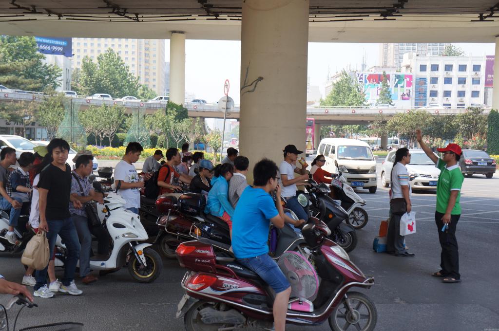 志愿者在立交桥下指挥交通