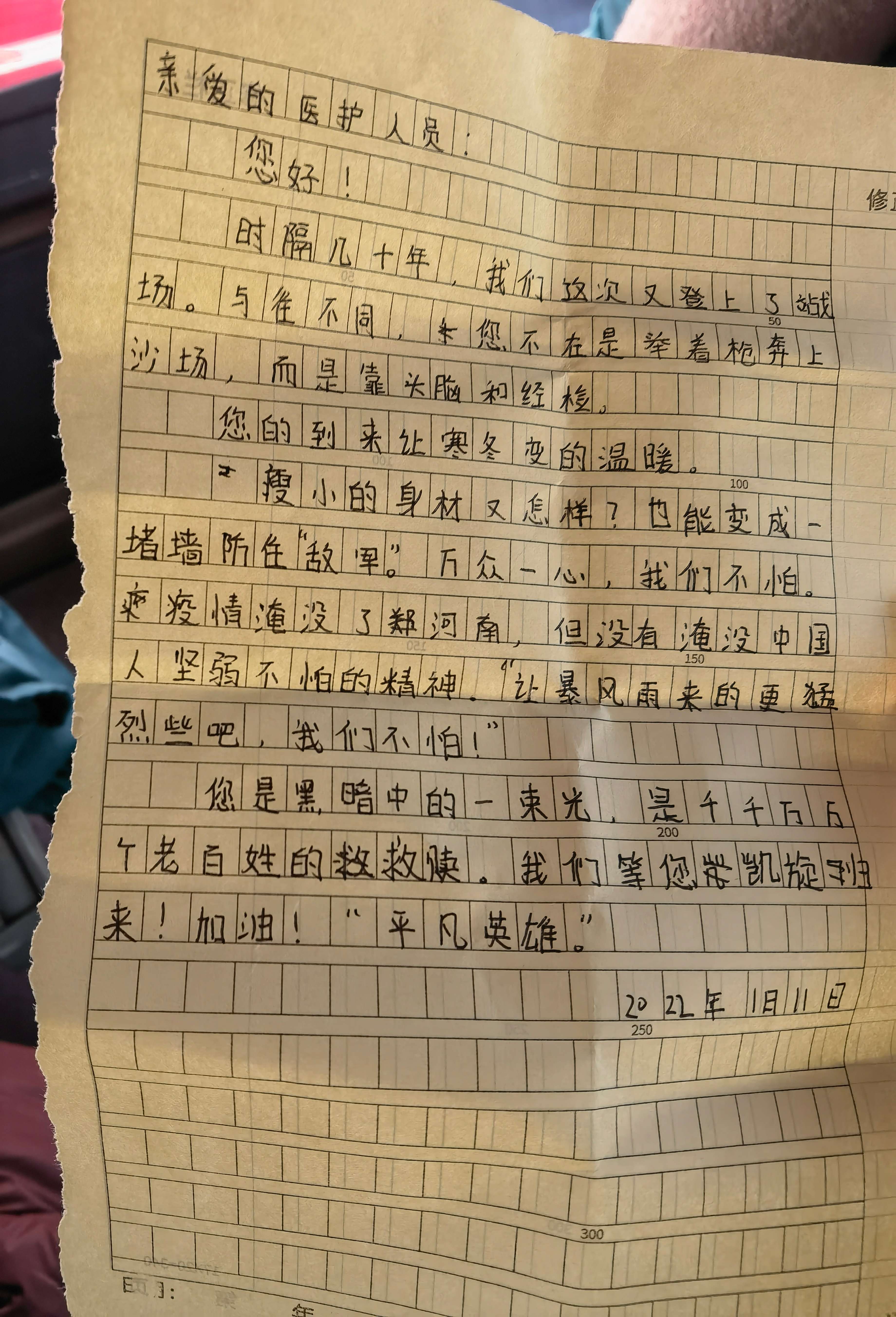 本网讯(文/潘向昆 图/田辉) 2022年1月11日,一封来自郑州湾景一号小区小朋友写给我们医护人员的信让三附院核酸采样队员们备受感动,在信中,小朋友用朴实、童真的语言,真挚的感情表达了他对三附院医护人员的感激和敬意,让这个寒冷的冬季充满爱意和温暖。