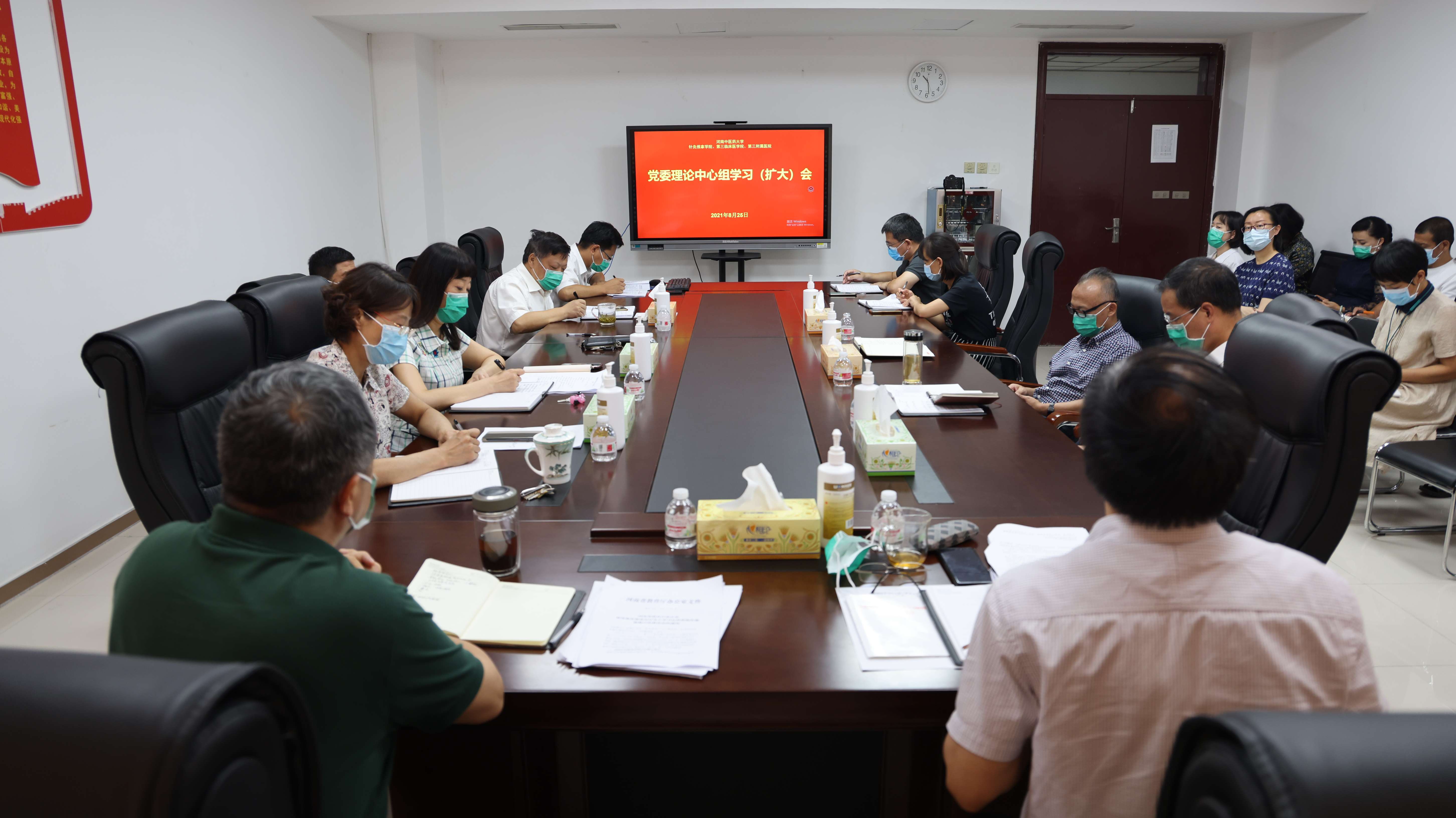 本网讯(文图/潘向昆)为认真贯彻落实教育部、省教育厅关于学习《中华人民共和国教育法》和校党委宣传部《关于学习宣传新修订的教育法的通知》的文件精神,2021年8月25日上午,三附院党委理论学习中心组召开扩大会议,学习新修订的《中华人民共和国教育法》。院党委理论学习中心组成员和各党总支部书记及医务、教务、学工、研究生等部门负责人参加学习会。院党委书记周运峰主持会议。