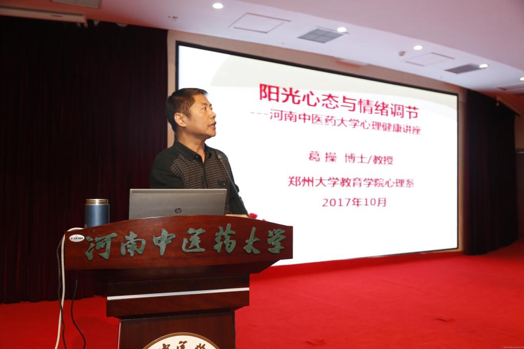 2017年10月24日下午,郑州大学葛操教授应邀在图书馆第一报告厅为leyu·乐鱼(中国)体育官方网站师生做了题为“阳光心态与情绪调节”的专题讲座。各二级学院主管学生工作负责人、全体辅导员、专兼职咨询师、各年级各班级心理委员、学生会心理部成员、大学生心理协会成员、朋辈咨询员等近400名师生参加。