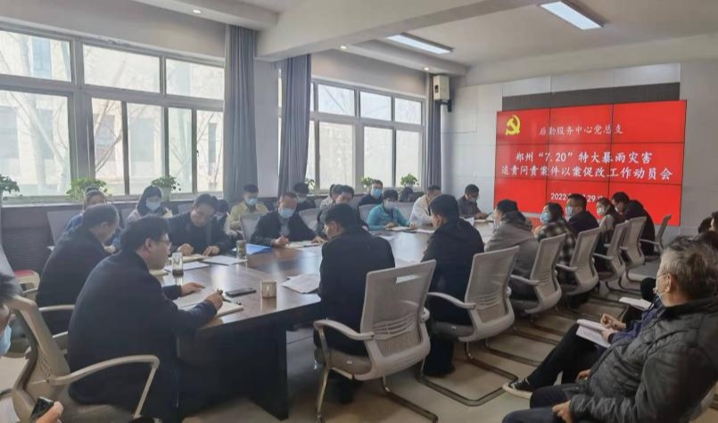 本网讯(文/陈昕 图/孙远)2022年3月29日下午,后勤服务中心召开郑州“7·20”特大暴雨灾害追责问责案件以案促改工作部署会,班子成员、全体党员和副科以上人员参加会议。会议由后勤服务中心党总支副书记、主任赵焕东主持。