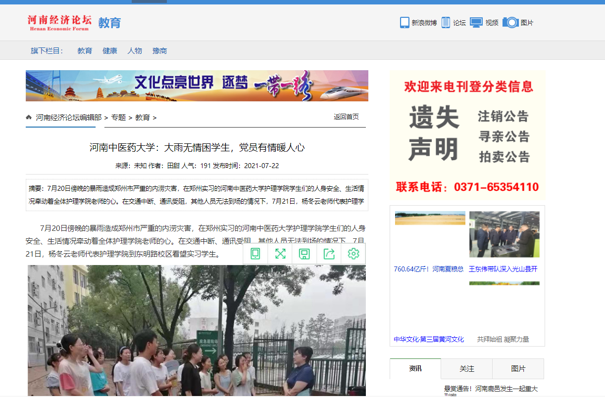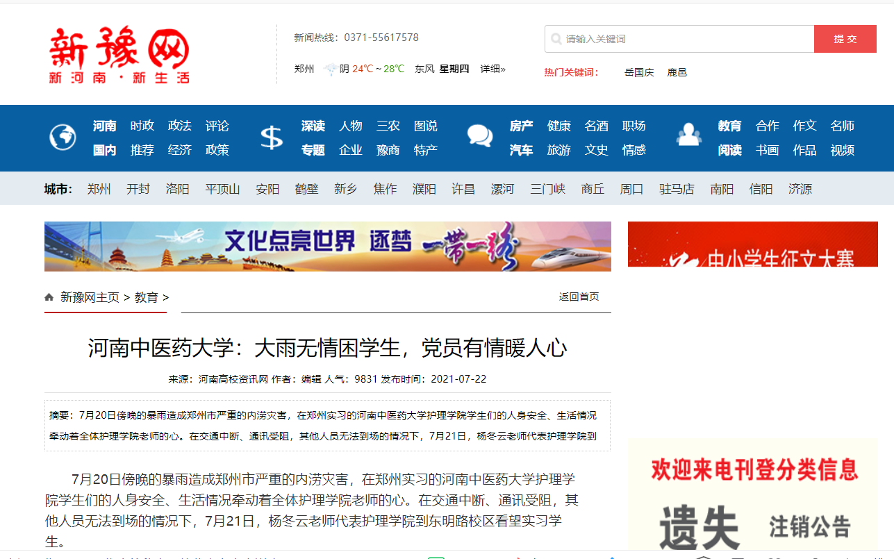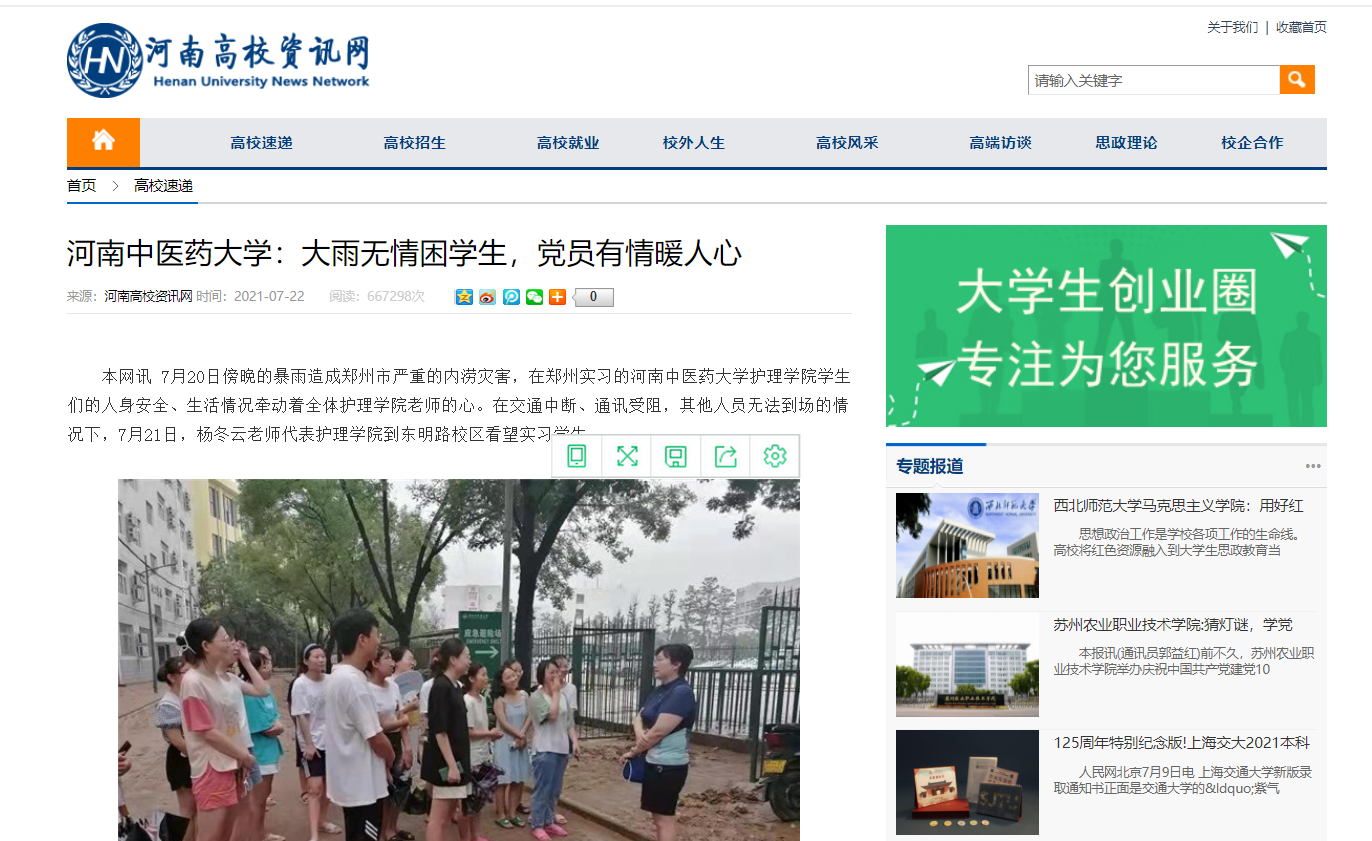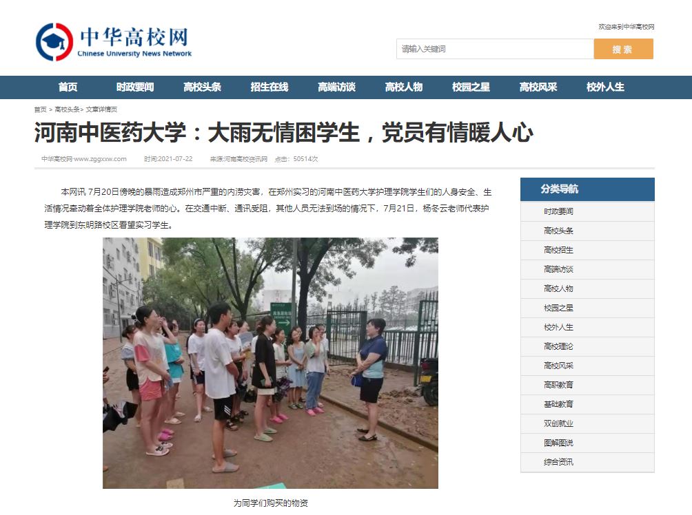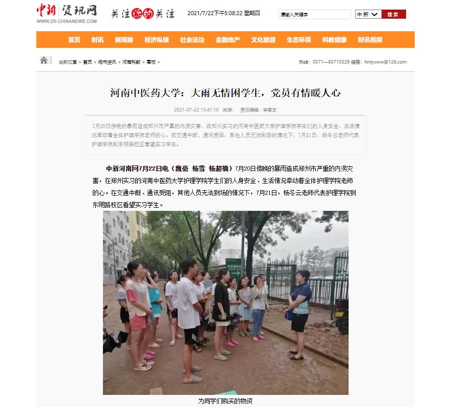 编者按:2021年7月22日,中华高校网、中新资讯网、河南高校资讯网、新豫网、河南经济论坛、中原经济网等多家媒体对leyu·乐鱼(中国)体育官方网站《leyu·乐鱼(中国)体育官方网站:大雨无情困学生,党员有情暖人心》事件进行报道。