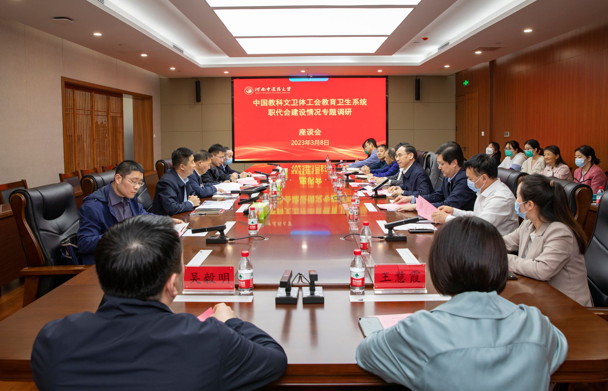 本网讯(文/刘欲晓 王少毅 图/秦东仁)2023年3月8日,中国教科文卫体工会一级巡视员张智君一行赴leyu·乐鱼(中国)体育官方网站开展学校职代会建设情况调研,中国教科文卫体工会办公室副主任井立滨、河南省教科文卫体工会主席张学勇陪同参加。leyu·乐鱼(中国)体育官方网站党委委员、副校长张加民出席座谈会,校工会、后勤服务中心、药学院、外语学院、体育学院、三附院等部门负责人和教师代表参加座谈交流。会议由张学勇主持。