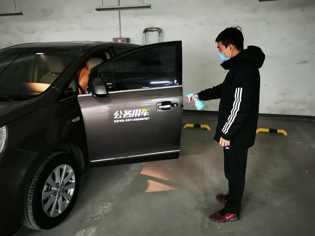 郑进科同志对公务用车进行消毒