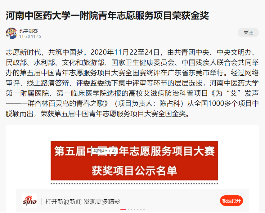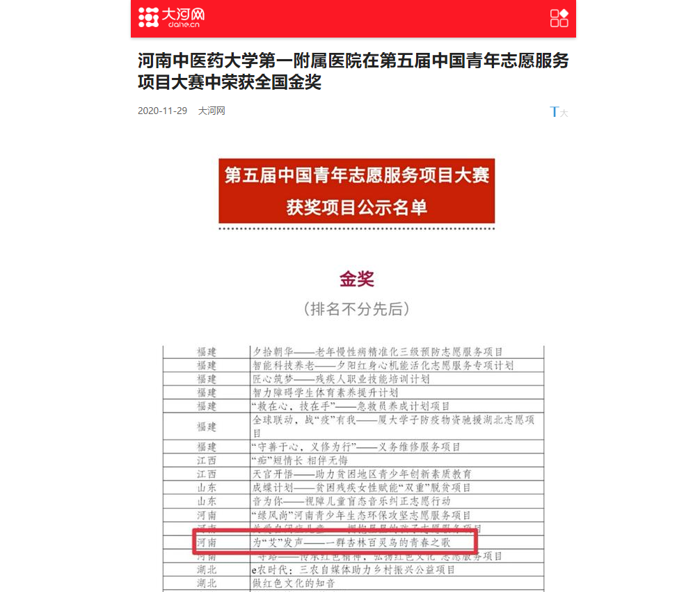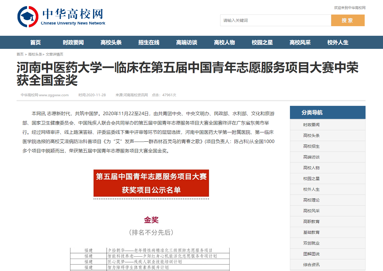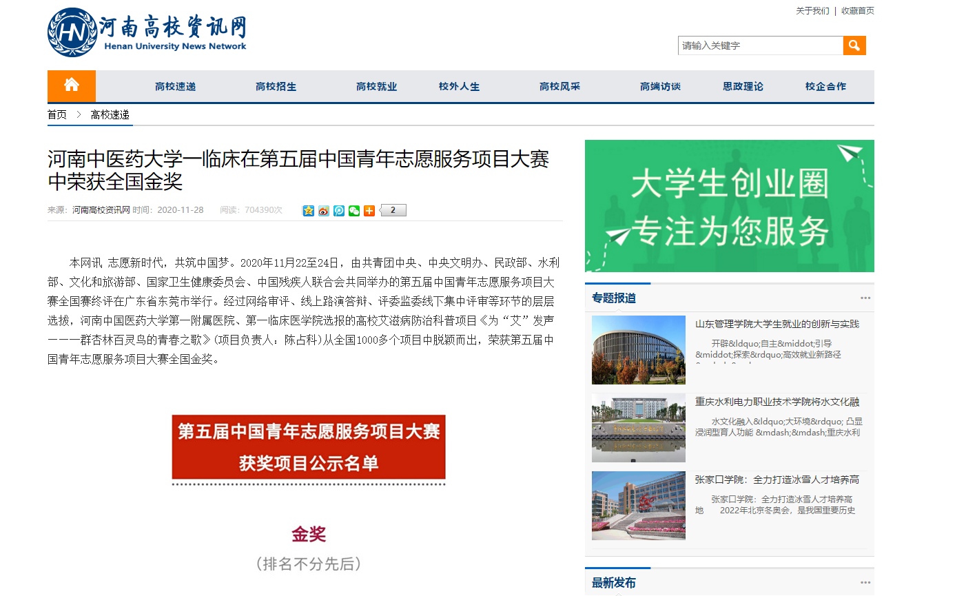 编者按:2020年11月28日-30日,中青网、大河网、中华高校网、河南高校资讯网、新浪新闻等对leyu·乐鱼(中国)体育官方网站项目荣获中国青年志愿服务项目大赛全国金奖进行报道。