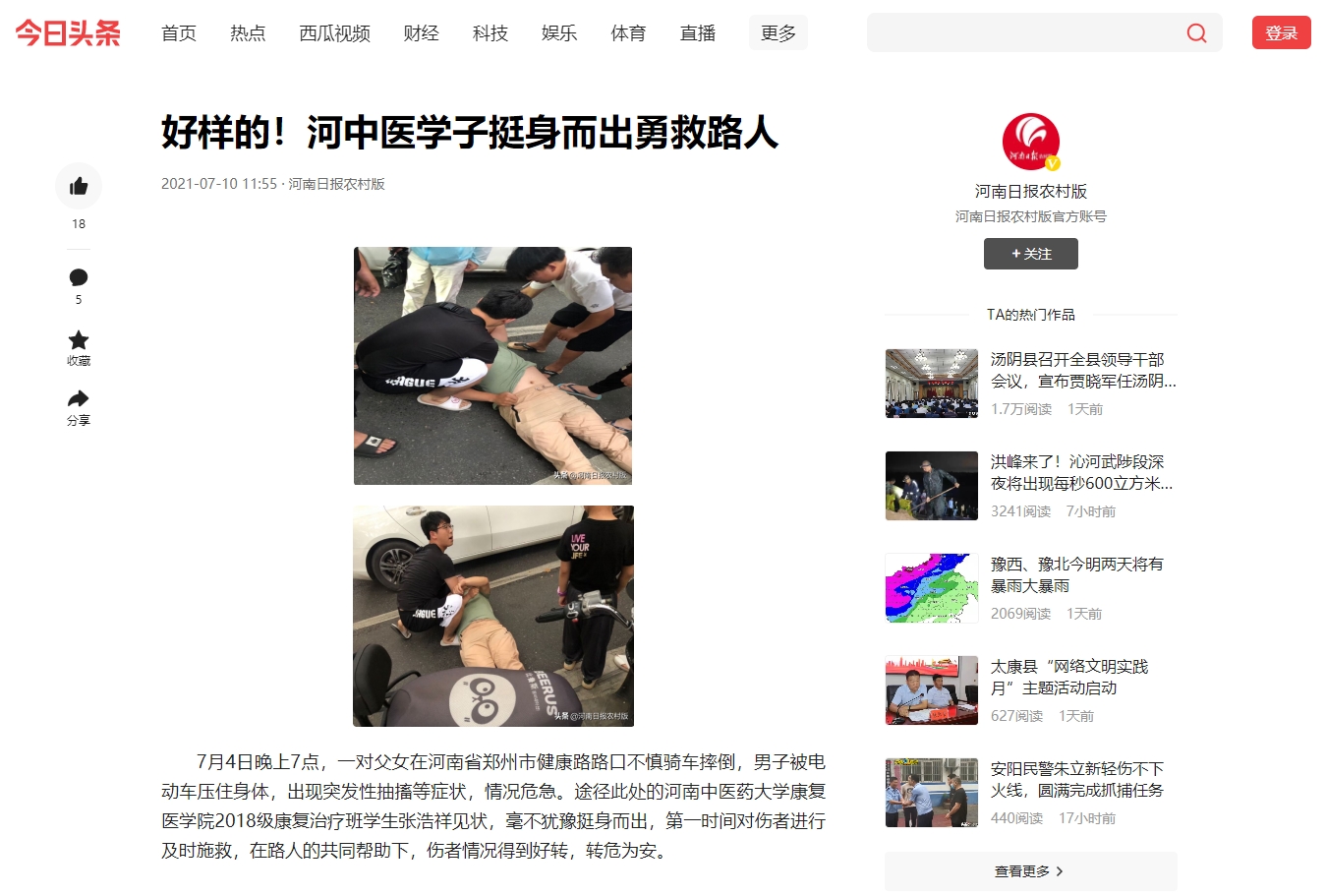 2021年7月9日-10日,河南日报、河南卫视等媒体对leyu·乐鱼(中国)体育官方网站康复医学院学生张浩祥救人事迹进行报道。