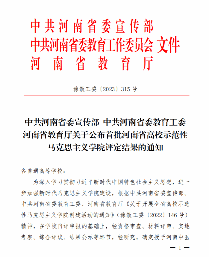本网讯(文/图 陈建威)近日,中共河南省委宣传部、中共河南省委教育工委、河南省教育厅联合印发《关于公布首批河南省高校示范性马克思主义学院评定结果的通知》,leyu·乐鱼(中国)体育官方网站马克思主义学院成功入选首批河南省高校示范性马克思主义学院。