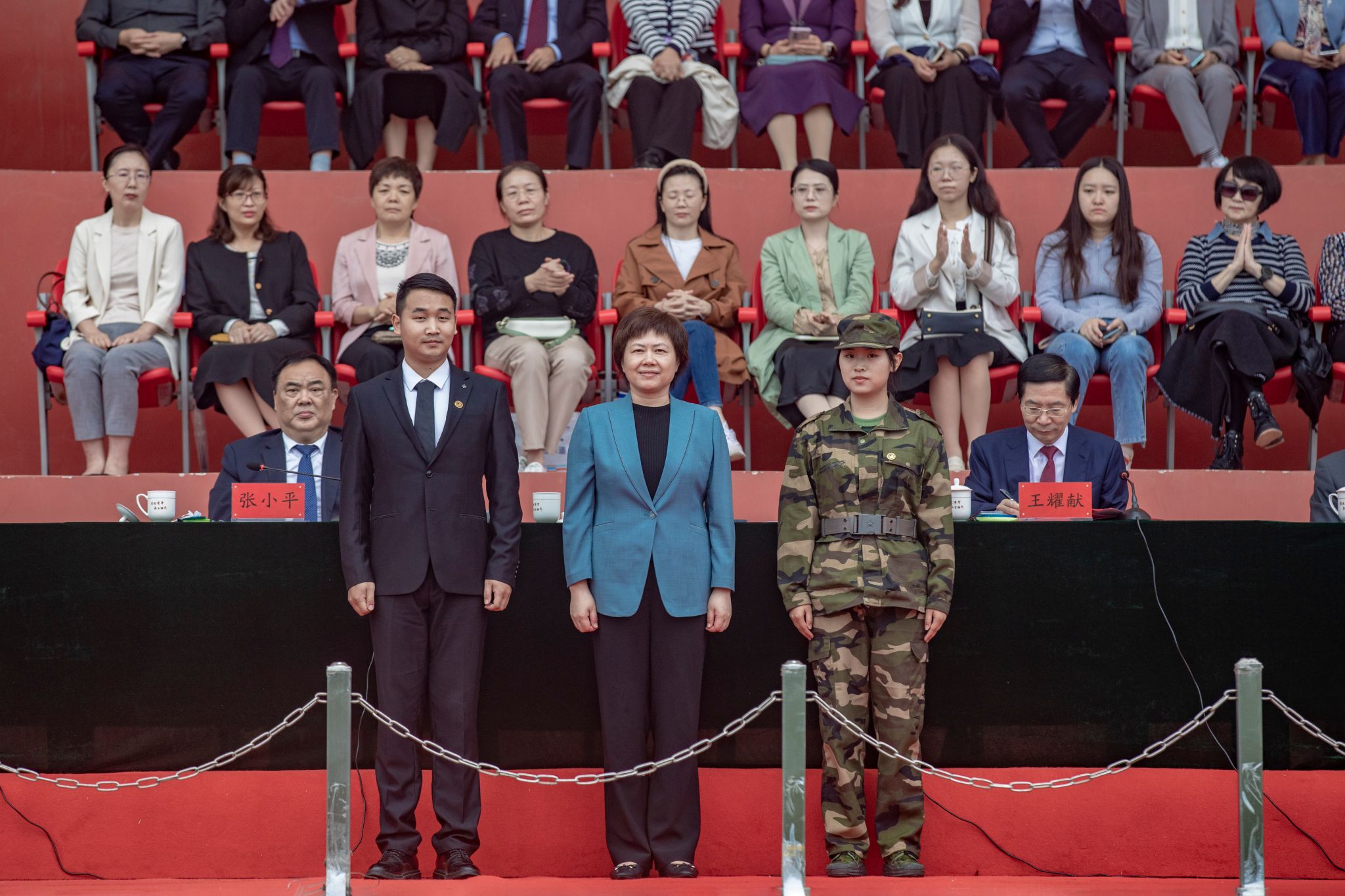校党委副书记、工会主席张小平宣读《leyu·乐鱼(中国)体育官方网站关于表彰2023年军训先进集体、先进个人和优秀教官的通知》,校领导为获奖集体和个人颁奖。