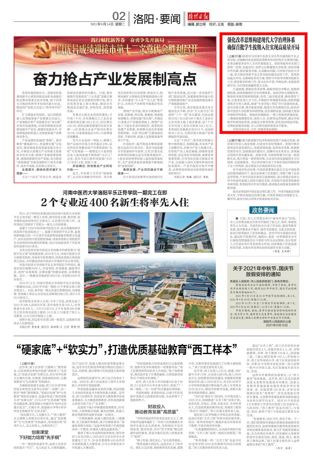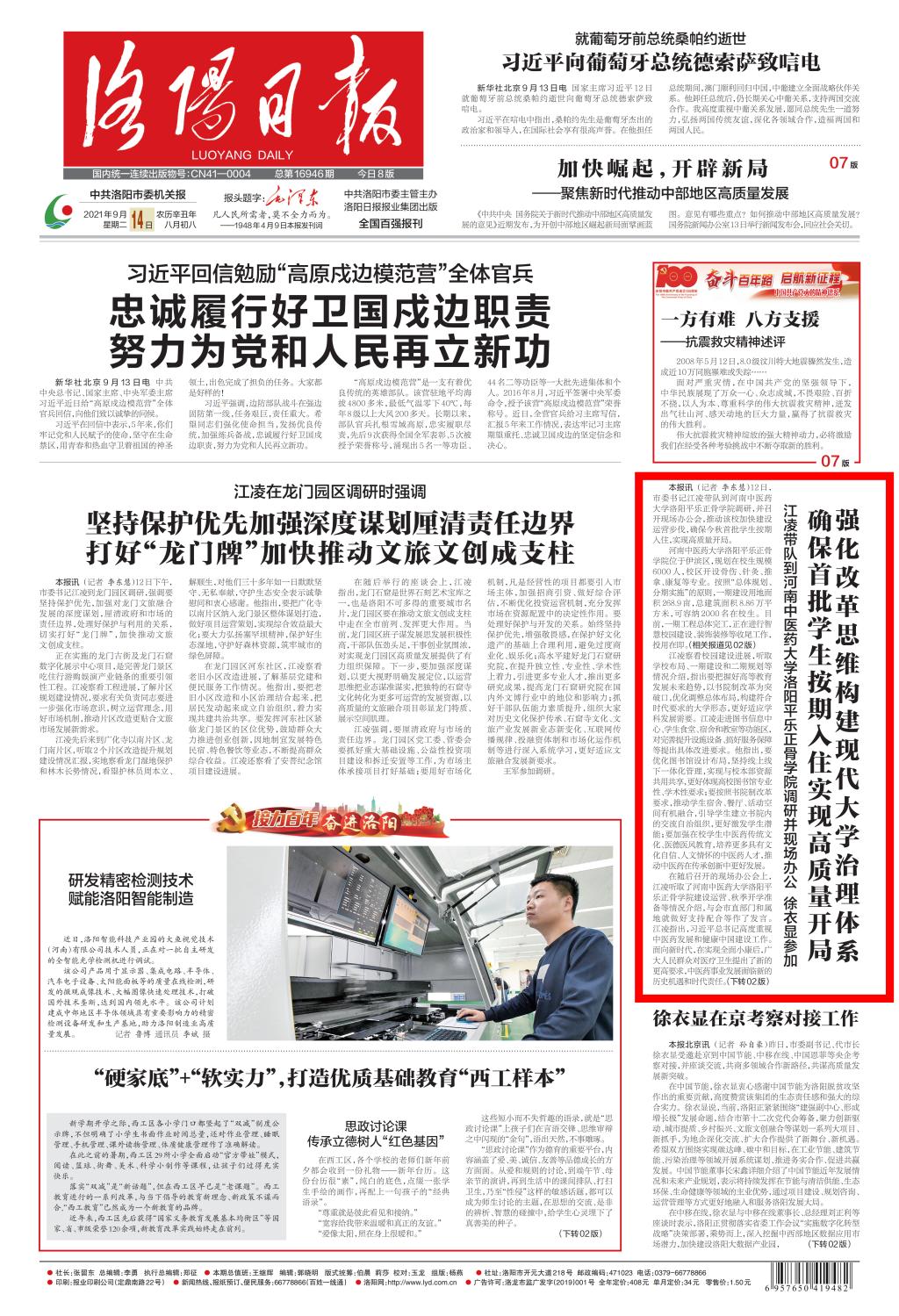 编者按:2021年9月14日,洛阳日报对洛阳市委书记江凌带队到leyu·乐鱼(中国)体育官方网站洛阳平乐正骨学院调研并现场办公进行报道。现将全文刊发如下: