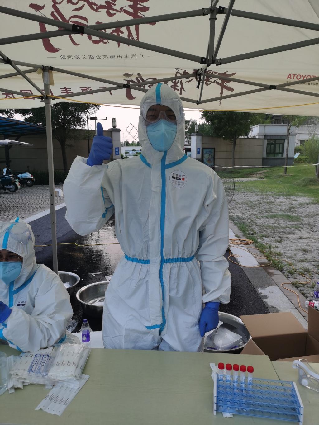 2021年8月1日起,耿霈霖积极参与到所在社区核酸采集工作。顾不得初次穿上厚厚的防护服,带来的闷热、活动受限等诸多不便,耿霈霖就立即投入到了核酸采样的工作中,不间断工作7个小时,采集样本1100多份,在整个过程中衣服湿透又蒸干又湿透,全身的汗水往鞋里流,期间的阵阵胸闷、头晕以及缺水的恶心感,都在考验着他。从8月1日至8月6日连续奋战5天,耿霈霖全程参与当地两轮核酸采集工作,完成了3000多份样本的采集。