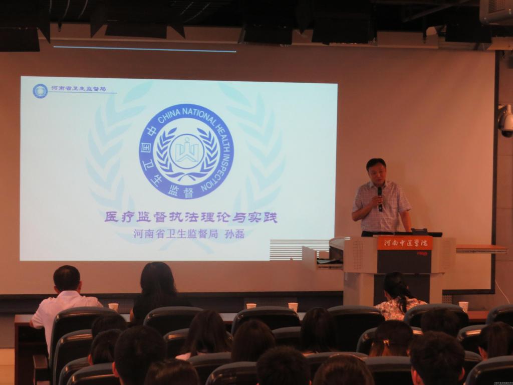 孙磊副局长以《医疗监督执法理论与实践》为题,讲述了改革开放以来我国医疗卫生监督工作的改革历程、医疗卫生监督的法律体系、监督对象、内容、方法,并针对当前医疗领域存在的突出问题及其成因进行了深入分析,介绍了主要违规行为类型及处理结果,最后结合自己的工作实践提出了加强医疗监督的对策。孙局长认为,在当前形势下,要做好卫生监督执法,必须加强卫生监督体制建设,制定和完善医疗机构监督相关法律,加强监督队伍建设,提高医疗监督执法能力,加强对卫生监督机构财政投入,积极探索科学的监管模式。孙局长的报告理论与实践结合紧密,内容丰富、图文并茂、讲述生动,深受与会师生好评。