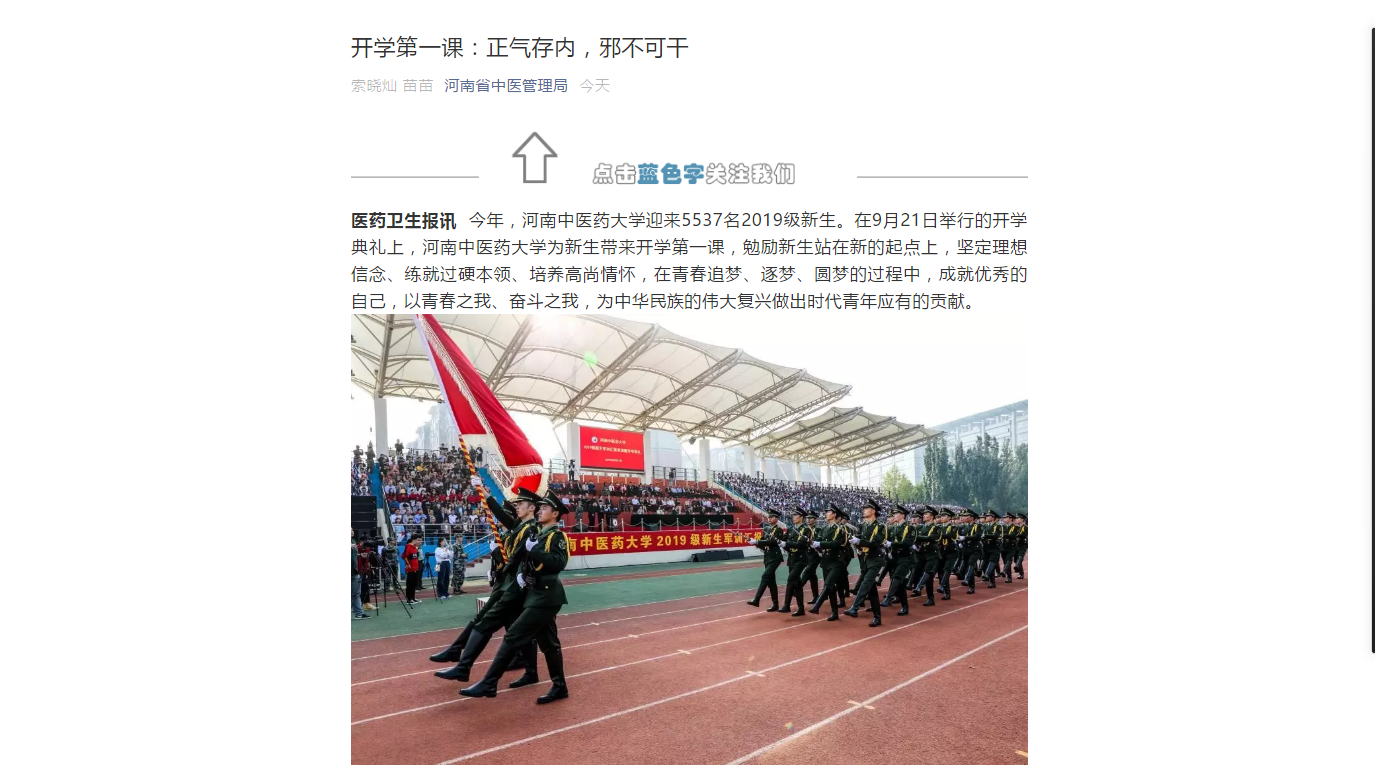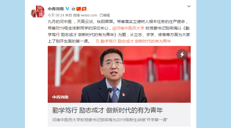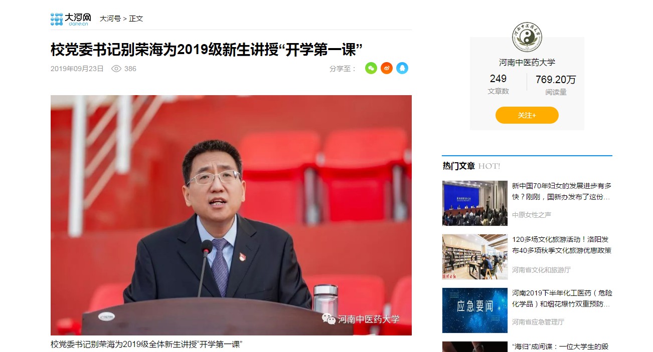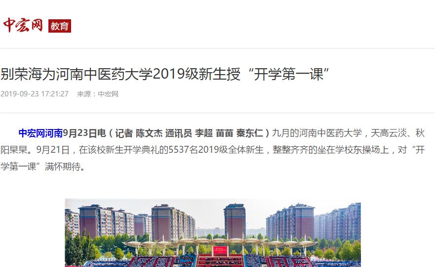 编者按:2019年9月23日,中宏网、中青河南官网微博、医药卫生报、大河号等多家媒体广泛报道leyu·乐鱼(中国)体育官方网站党委书记别荣海为2019级新生讲授“开学第一课”。