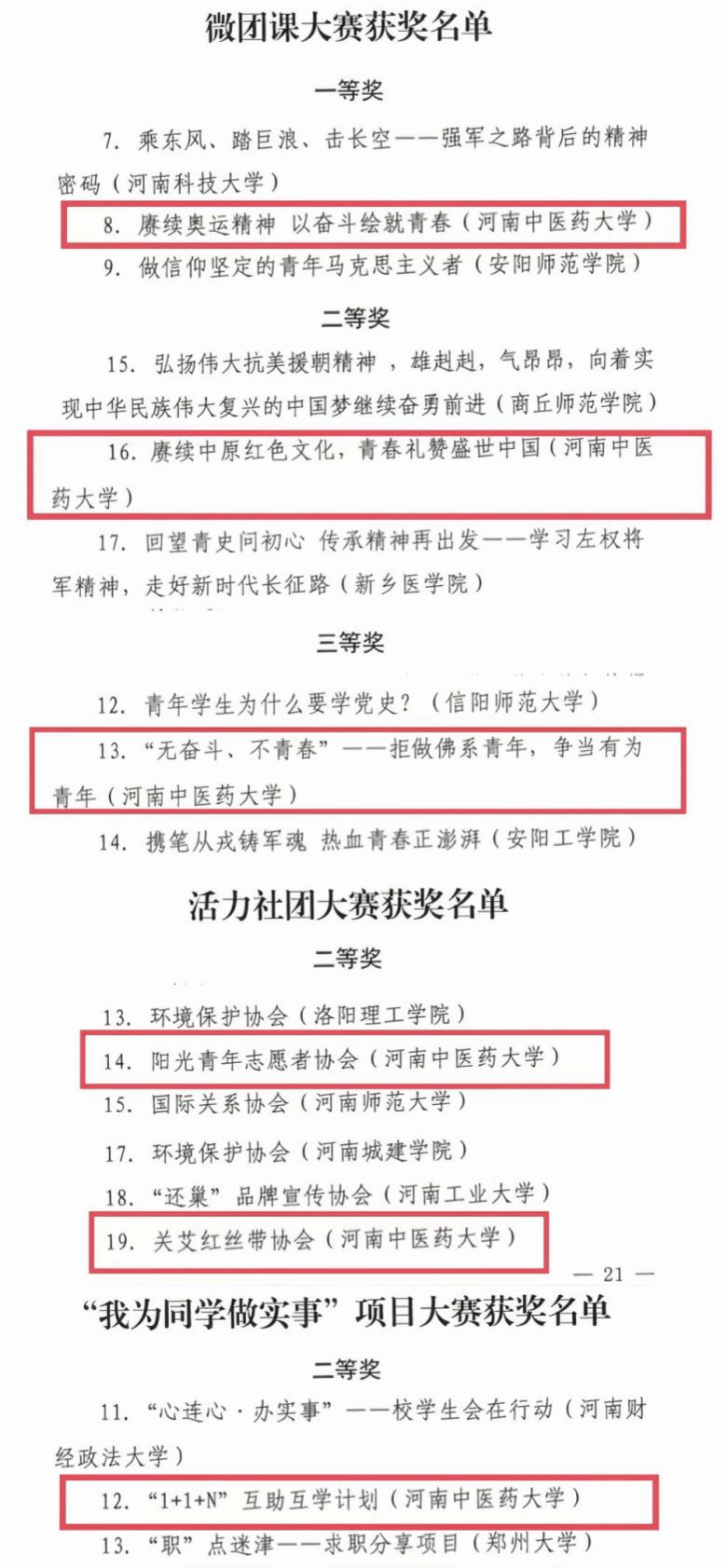 本次大赛在持续巩固和深化“全团抓思想政治引领”“全团大抓基层”“全团抓学校”的改革方向和建设成果,进一步提升全省高校共青团引领力、组织力、服务力,推动我省高校团学组织建设和改革向纵深发展的背景下举办。自大赛启动以来,leyu·乐鱼(中国)体育官方网站团委积极响应,精心策划,动员各级团组织、团干部广泛参与。经过校内选拔、省级复赛和决赛等环节,获得多项荣誉。在微团课大赛中,尚真书院侯相俊老师主持的《赓续奥运精神 以奋斗绘就青春》荣获一等奖,骨伤学院孙晓涵老师主持的《赓续中原红色文化 青春礼赞盛世中国》荣获二等奖,中医学院(仲景书院)武雪凡老师主持的《“无奋斗、不青春”--拒做佛系青年,争当有为青年》荣获三等奖;在活力社团大赛中,第一临床医学院的“关艾”红丝带协会和针灸推拿学院的“阳光”青年志愿者荣获二等奖;在“我为同学做实事”项目大赛中,骨伤学院“‘1+1+N’互助互学计划”项目荣获二等奖。