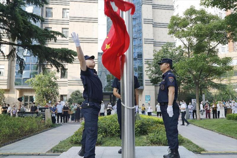 7月1日清晨,在医院仲景广场前,医院全体领导、各科室医生护士代表统一着装,胸前佩戴锃亮的党徽,参加升国旗仪式。