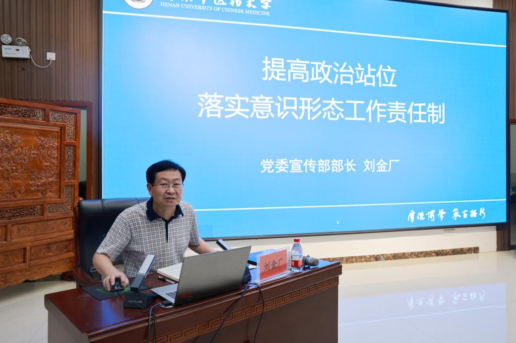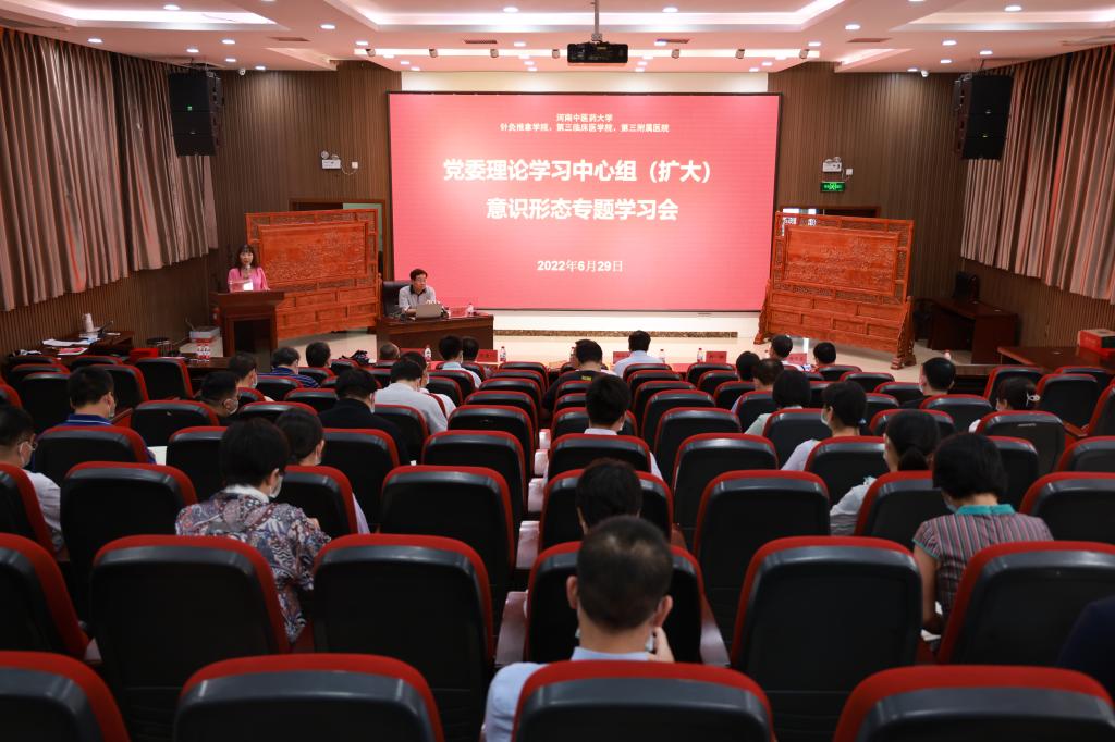 本网讯(文/图潘向昆) 按照学校2022年党委理论学习中心组及教职工学习安排,2022年6月29日下午,三附院召开党委理论学习中心组(扩大)意识形态专题学习会。学校党委委员、宣传部部长刘金厂受邀作题为《提高政治站位 落实意识形态工作责任制》专题报告。医院在郑领导班子成员和各党总支、党支部书记、相关职能部门负责人及医院通讯员、信息员代表参加学习。党委副书记焦钧主持会议。