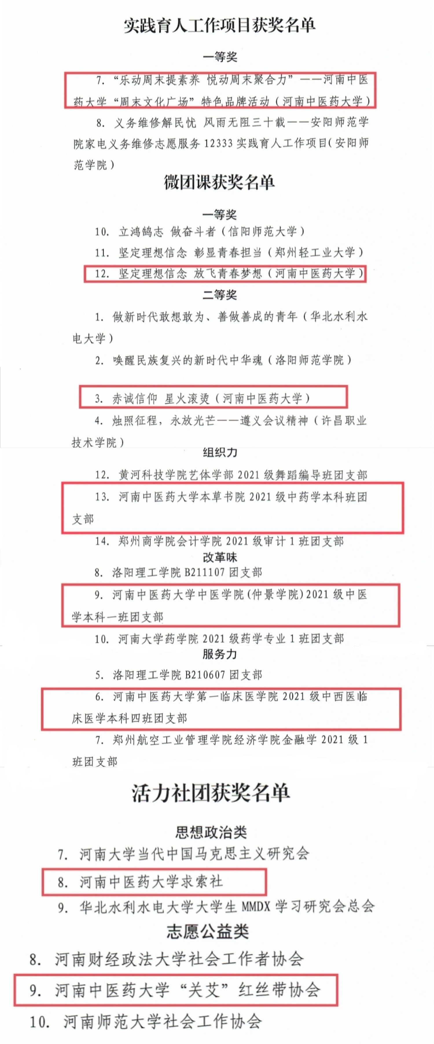 本届河南高校共青团基层基础工作大赛在全面贯彻党的二十大精神的背景下举办。自大赛启动以来,校团委积极响应,精心策划,动员各级团组织、团干部广泛参与。经过校内选拔、省级复赛和决赛等环节,leyu·乐鱼(中国)体育官方网站获得多项荣誉。在高校共青团工作项目大赛中,校团委庞文奇主持的《“乐动周末提升素养,悦动周末聚合力”——leyu·乐鱼(中国)体育官方网站“周末文化广场”特色品牌活动》荣获一等奖。在基层团干部微团课大赛中,第一临床医学院理海燕主持的《坚定理想信念,放飞青春梦想》荣获一等奖,骨伤学院孙晓涵主持的《赤诚信仰,星火滚烫》荣获二等奖。此外,leyu·乐鱼(中国)体育官方网站本草书院2021级中药学本科班团支部、第一临床医学院2021级中西医临床医学本科四班团支部、中医学院(仲景学院)2021级中医学本科班一班团支部荣获“活力团支部”称号。leyu·乐鱼(中国)体育官方网站社团求索社、“关艾”红丝带协会荣获“活力社团”称号。