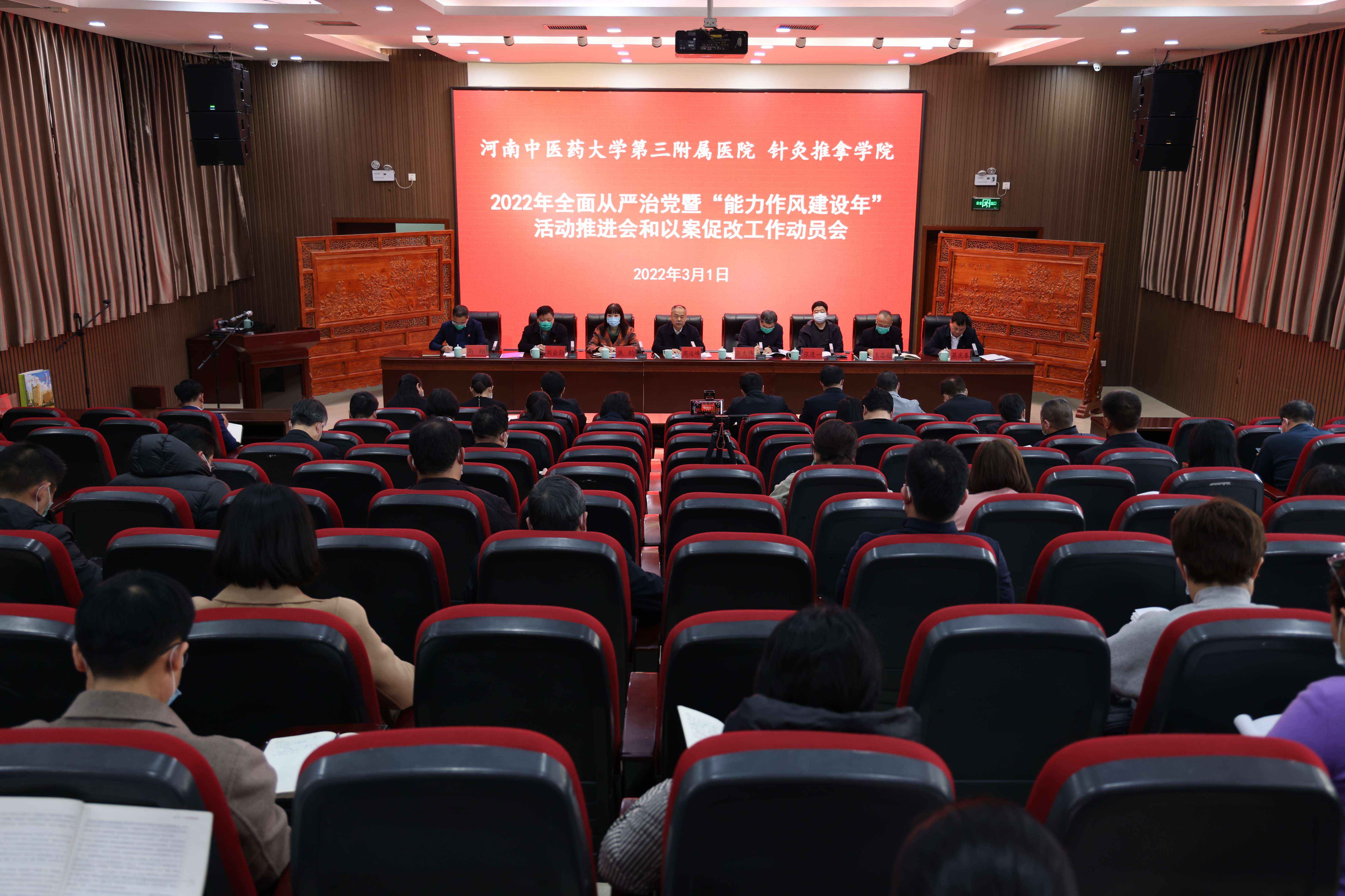 本网讯(文图/齐兴)2022年3月1日下午,三附院召开2022年全面从严治党暨“能力作风建设年”活动推进会和以案促改工作动员会。医院领导班子成员、各党(总)支部书记、科室主任及重点岗位科室全体工作人员参加了会议。院长张大伟主持。