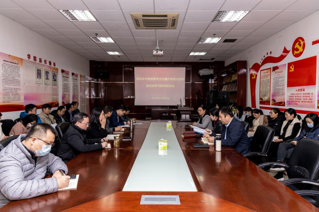 本网讯(文/滑恩帅 图/郭寅虎)为充分认识学习宣传贯彻党的十九届六中全会精神的重要意义,把学习宣传贯彻全会精神与党史学习教育有机结合,有效推动学院各项工作顺利的开展。信息技术学院党委于2021年11月30日下午,在A722召开学习党的十九届六中全会精神暨党史学习教育推进会,学院班子成员、全体教职工参加此次会议,会议由学院党委书记马赟主持。