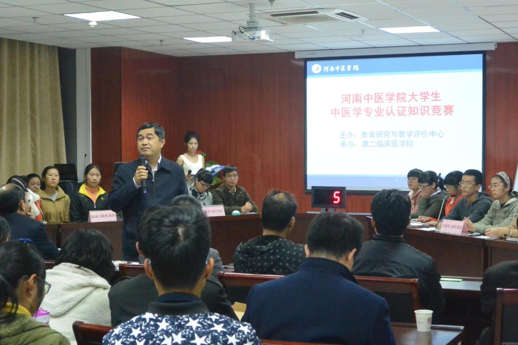 为进一步促进leyu·乐鱼(中国)体育官方网站大学生对中医学专业认证知识的学习,确保中医学专业认证工作的顺利开展,学校于2014年11月7日晚七点举办了大学生中医学专业认证知识竞赛。本次竞赛由教育研究与教学评价中心主办,第二临床医学院承办。教务处处长张大伟、教育研究与教学评价中心主任呼海涛、教学实验中心主任彭新、第二临床医学院党委书记王海亮及教务处和基础医学院相关领导担任竞赛评议专家,第二临床医学院和基础医学院50余位师生到场观摩了竞赛。