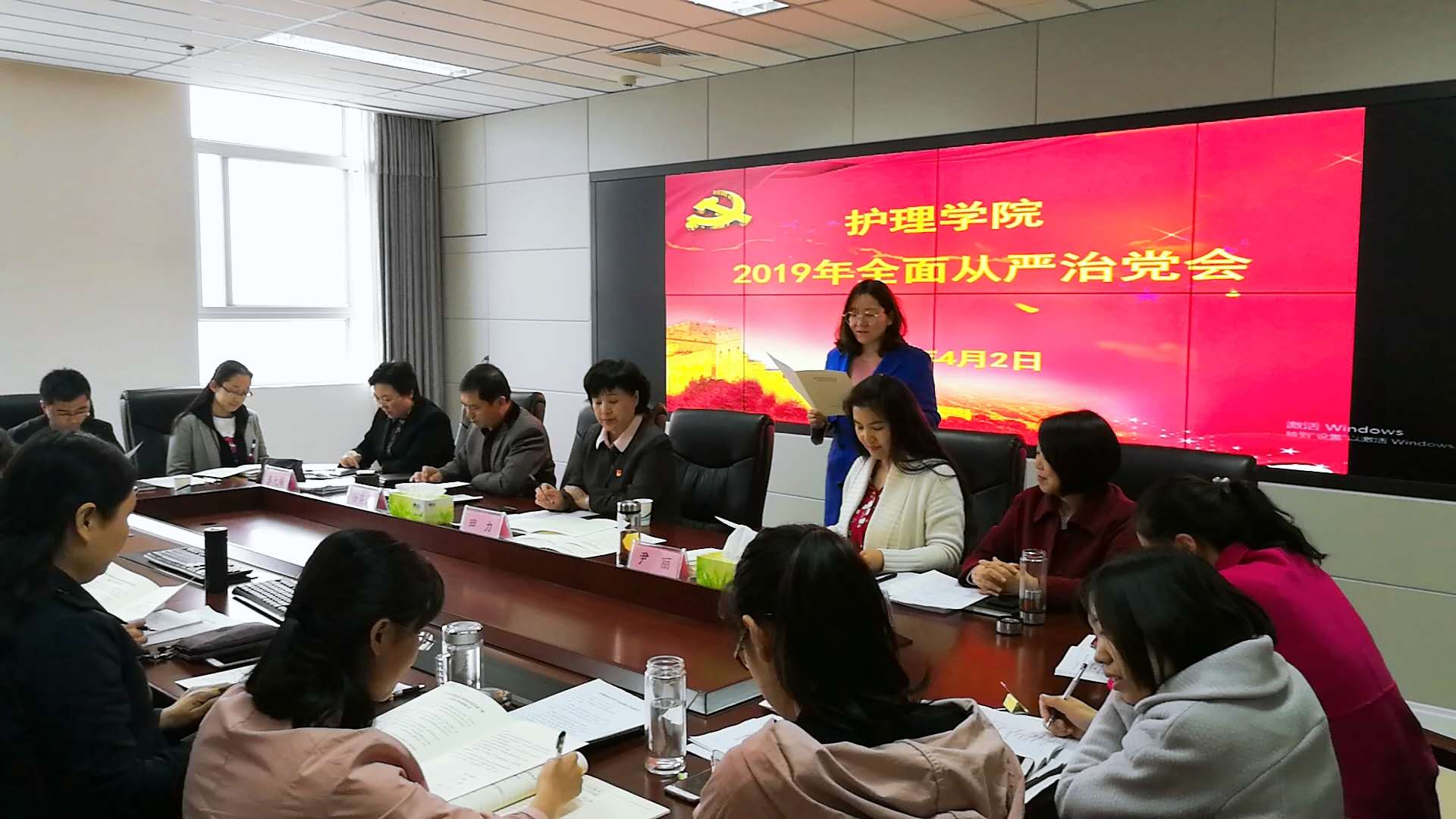 本网讯(文/杨雪 图/张贝贝)为进一步贯彻落实全面从严治党责任要求,2019年4月2日下午,护理学院在实训楼1015会议室召开2019年度全面从严治党工作会议。校党委委员、副校长田力出席会议并讲话,护理学院全体教职工参加会议。会议由护理学院副院长刘玲霞主持。