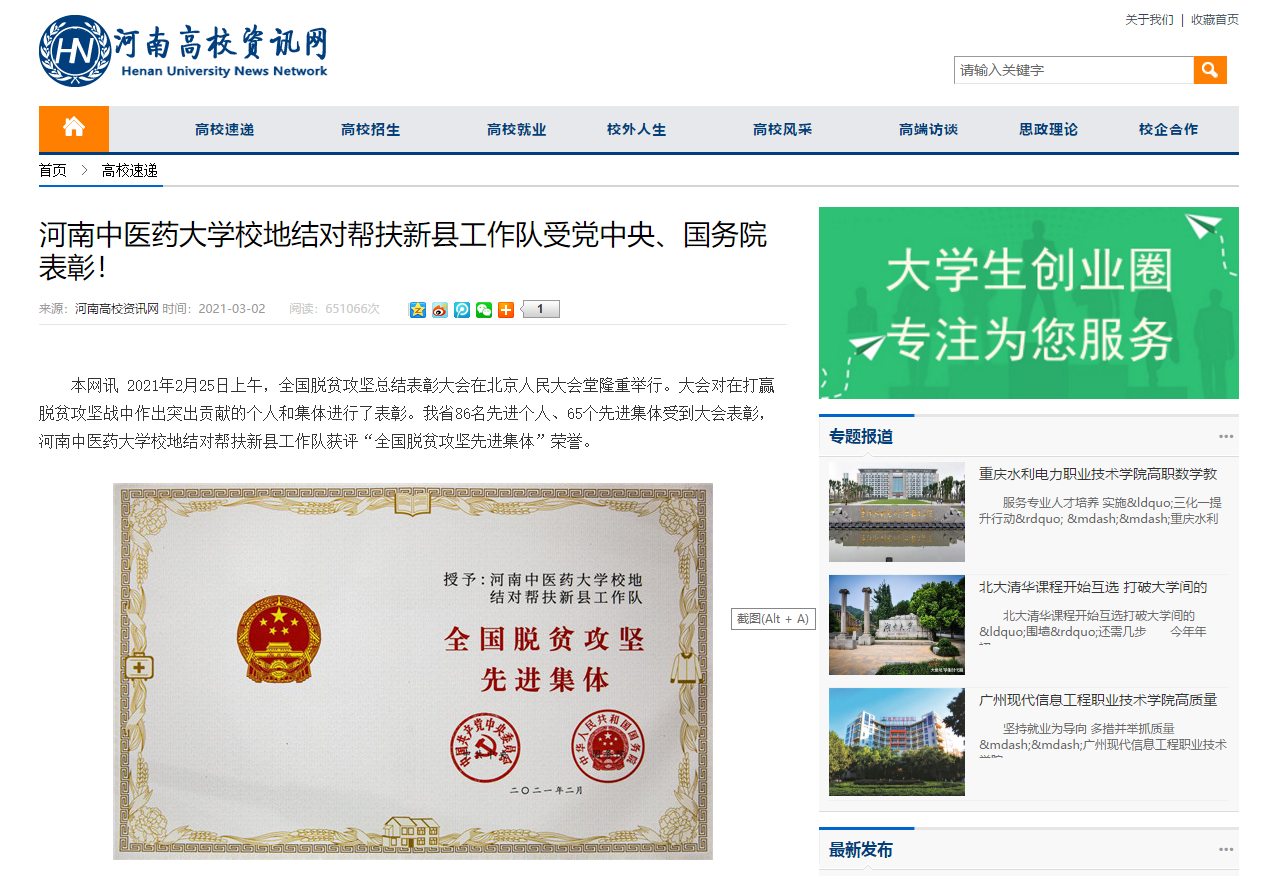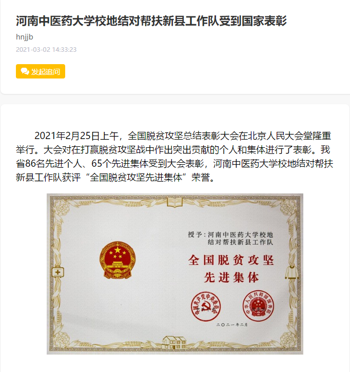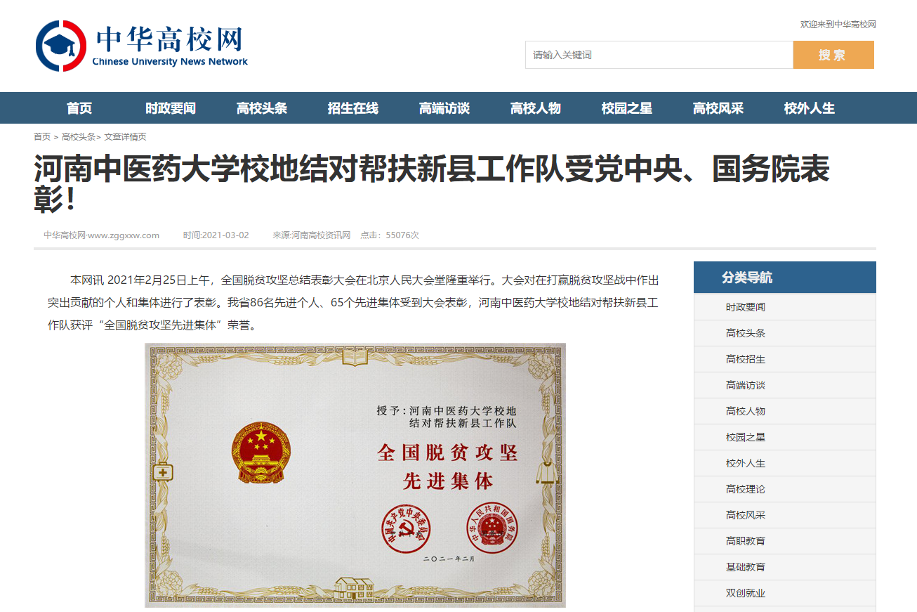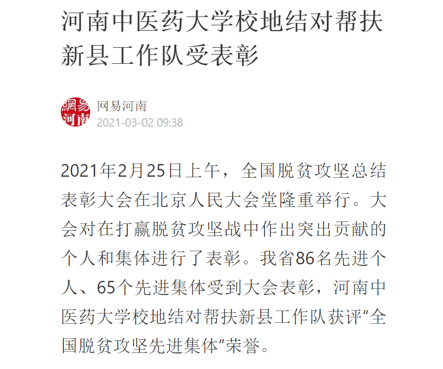 编者按:2021年3月2日,中国网、中华高校网、大河网、顶端新闻、河南高校资讯网、网易新闻等媒体广泛报道leyu·乐鱼(中国)体育官方网站荣获“全国脱贫攻坚先进集体”。