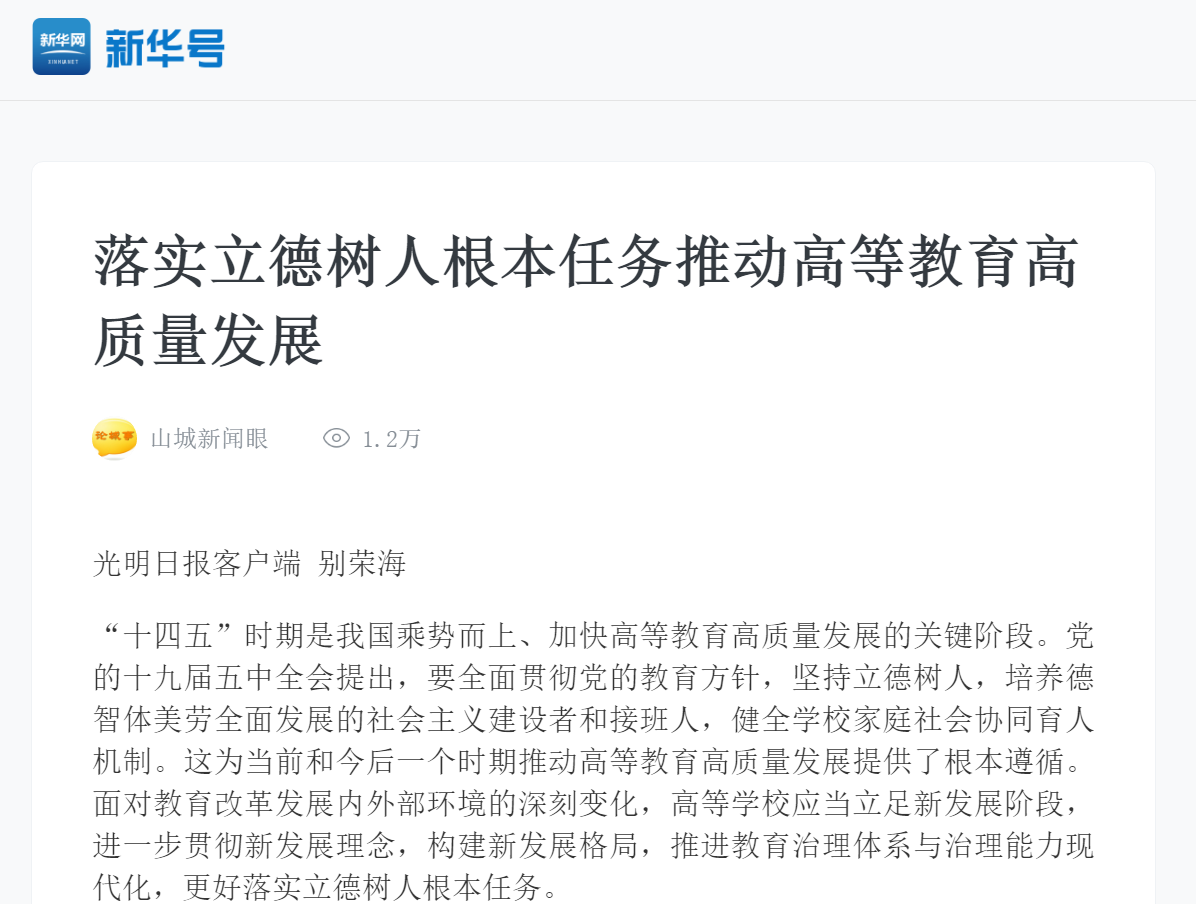 编者按:2021年2月3日,光明网、光明日报客户端刊发leyu·乐鱼(中国)体育官方网站党委书记别荣海的理论文章《落实立德树人根本任务推动高等教育高质量发展》,新华网、新华号进行了转载报道。