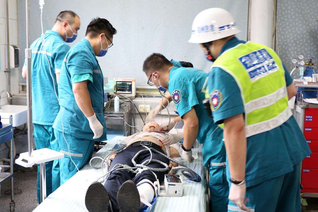 此次演练以“某建筑工地发生安全事故,造成墙体倒塌和人员伤亡”为背景。国家(河南)中医紧急医学救援队接到上级指令后,迅速派遣救援队赶赴现场,发现有10人受伤,救援小组立即根据“先救命后治伤、先救重后救轻”的原则分类救治;对于骨折伤员,采用中医手法复位、小夹板固定;同时,救护组长向院内报告现场情况。接到伤情报告后,医院立即启动紧急预案,各部门立即紧急响应。医务部根据需要,增派医务人员支援现场救治;协调相关科室医务人员准备抢救药械15分钟内到达急诊科抢救室,医技科室主任各自在科室待命。紧急救援队经过现场救治后,将伤员快速转运回医院,接受进一步救治。演练过程中,紧急医学救援队与医院各部门协同配合,整个救援过程紧张有序、配合默契、衔接良好。