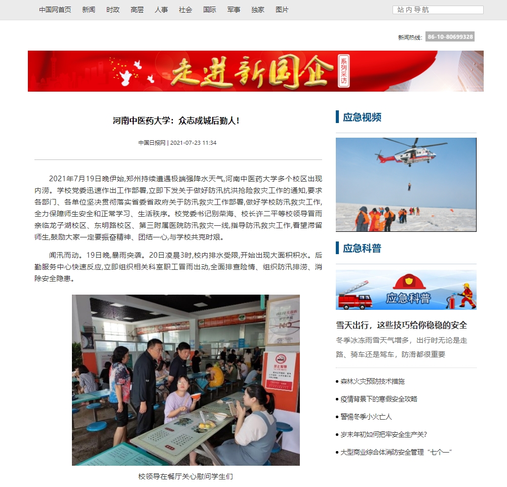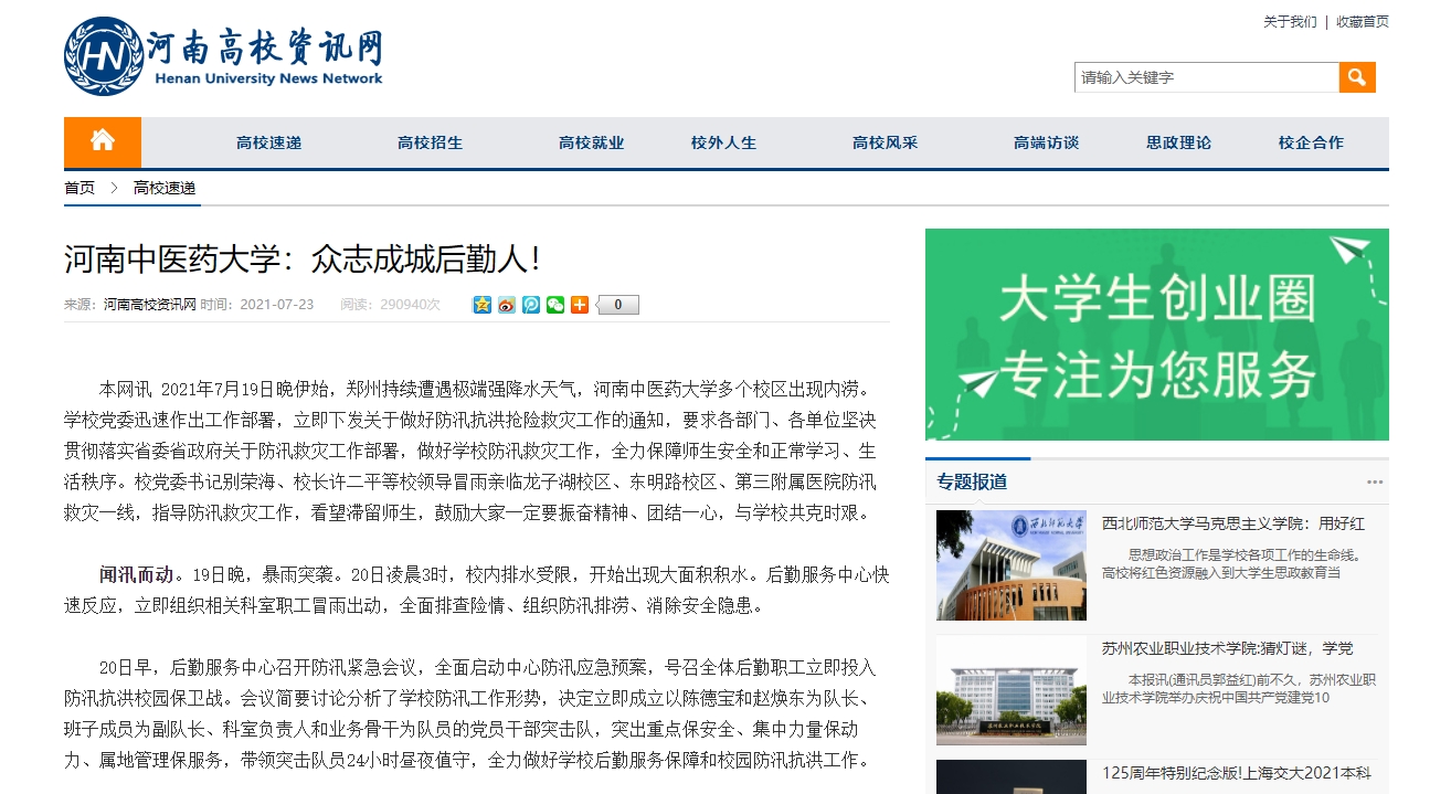 编者按:2021年7月23日,新华网客户端、中国网、大象新闻、河南高校资讯网等多家媒体对郑州暴雨时,leyu·乐鱼(中国)体育官方网站后勤服务中心及时召开防汛紧急会议,全面启动中心防汛应急预案,全体后勤职工积极打响防汛抗洪校园保卫战进行报道。