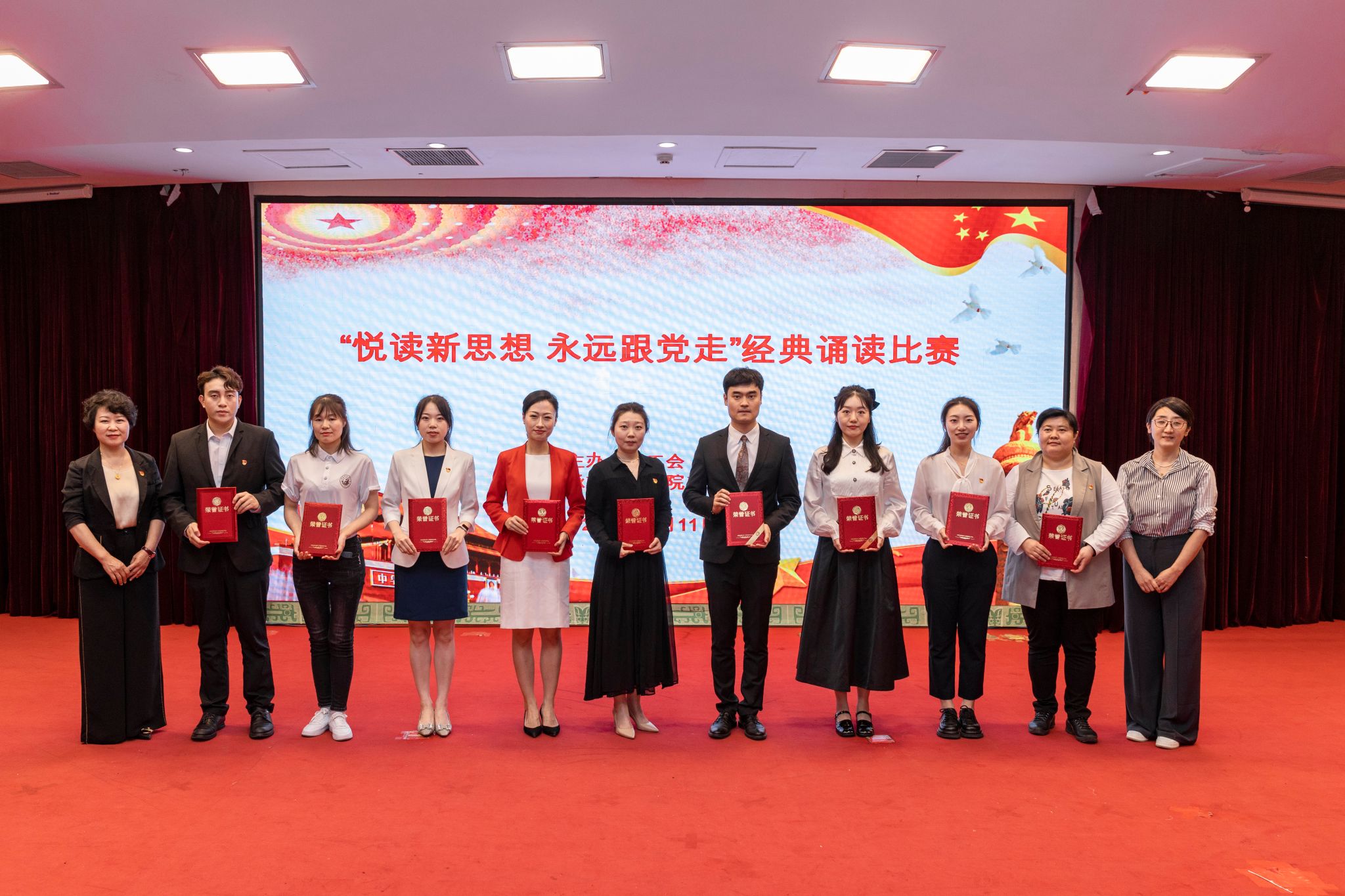 校工会女工委副主任常瑞宣布比赛结果,外语学院《放飞中国梦》、管理学院《读中国》、二附院《在中国大地上报道》获一等奖;三附院《江山就是人民,人民就是江山》、医学院《青春中国》、信息技术学院《我骄傲,我是中国人》等7部作品获二等奖;尚真书院《百年征程,领航中国》、本草书院《党的二十大之歌》、图书馆《百年礼赞》等10部作品获三等奖。
