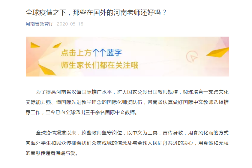 本网讯(文图/赵俊卿)近日,河南省教育厅微信公众号对leyu·乐鱼(中国)体育官方网站汉语教师志愿者任艳辉在疫情期间坚守在柬埔寨教学一线岗位的事迹进行了报道。任艳辉是leyu·乐鱼(中国)体育官方网站汉语国际教育专业2014级本科生毕业生,自2018年8月起赴柬埔寨任汉语教师志愿者,在近两年的教学中,她与柬埔寨学生相处融洽,见证了柬埔寨学生汉语学习过程中的点点滴滴,与任教学校师生结下了深厚的友谊。