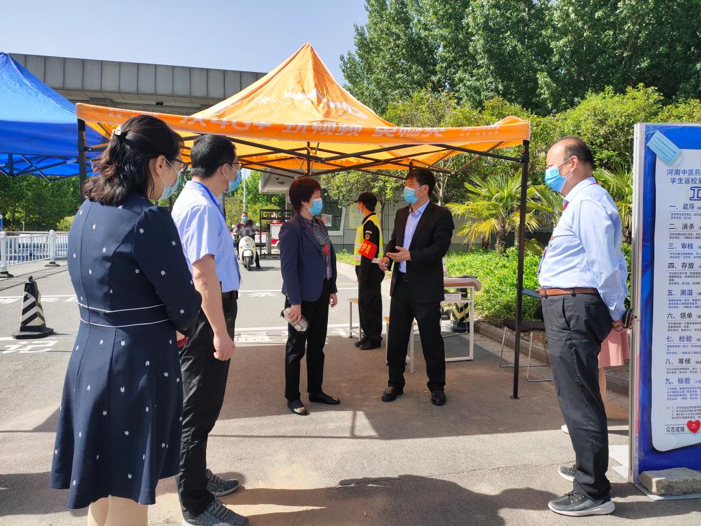 本网讯(文图/张涛)2020年5月12日上午,校长许二平带领校长办公室、学工部、保卫处和部分院部负责人到龙子湖校区北门现场指导校园管理工作。