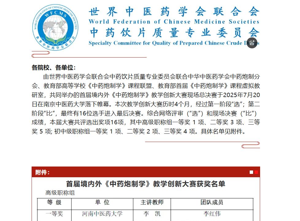 本网讯(文/药学院)近日,由世界中医药学会联合会中药饮片质量专业委员会联合中华中医药学会中药炮制分会、教育部高等学校《中药炮制学》课程联盟、教育部首届《中药炮制学》课程虚拟教研室,共同举办的首届境内外《中药炮制学》教学创新大赛于2025年7月20日在南京中医药大学落下帷幕。本次教学创新大赛历时4个月,经过第一阶段“选”,第二阶段“比”,最终评选出奖项16项,其中高级职称组一等奖1项、二等奖3项、三等奖5项;初中级职称组一等奖1项、二等奖2项、三等奖4项。leyu·乐鱼(中国)体育官方网站药学院中药炮制学教研室李凯教授获高级职称组一等奖。
