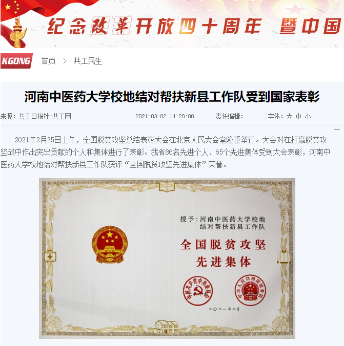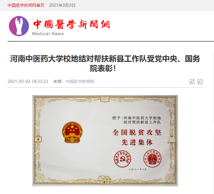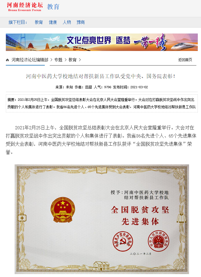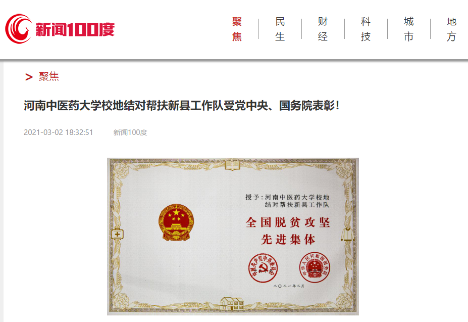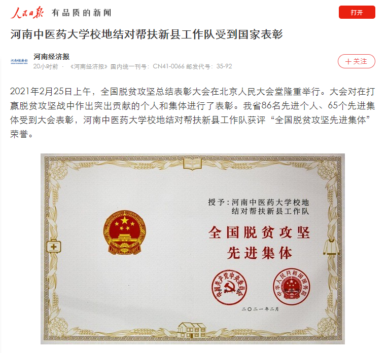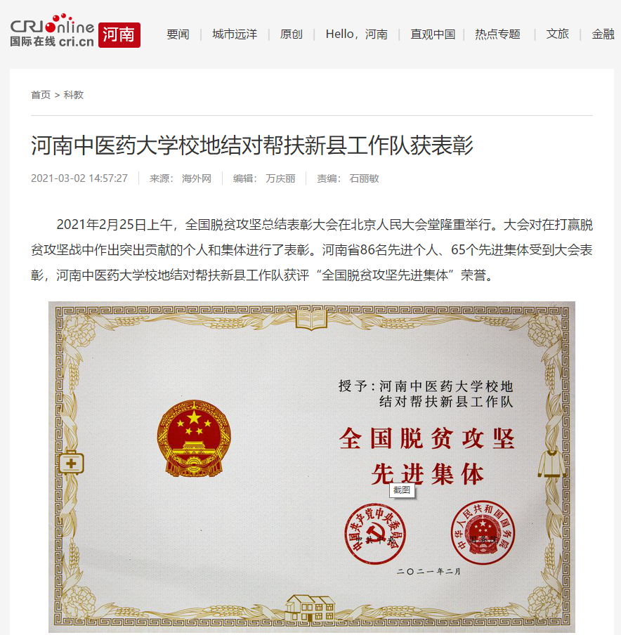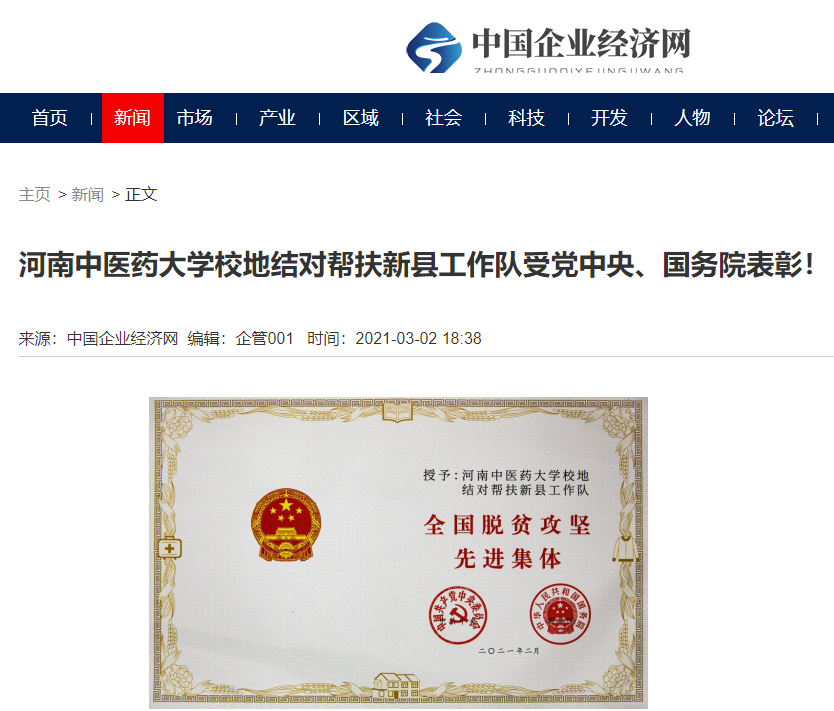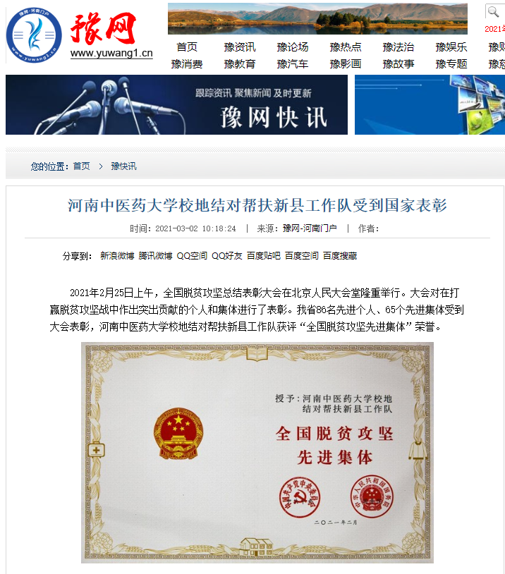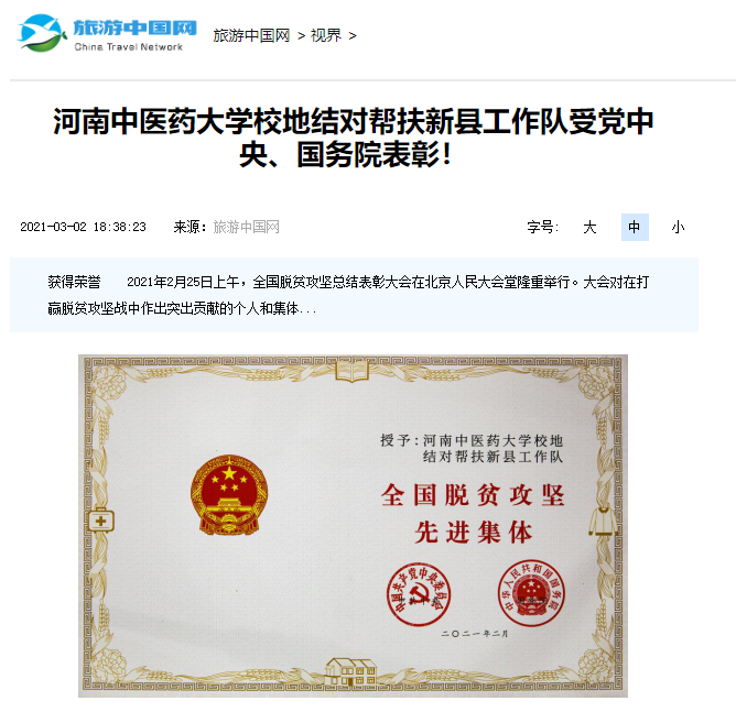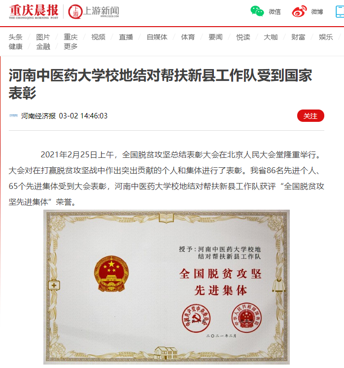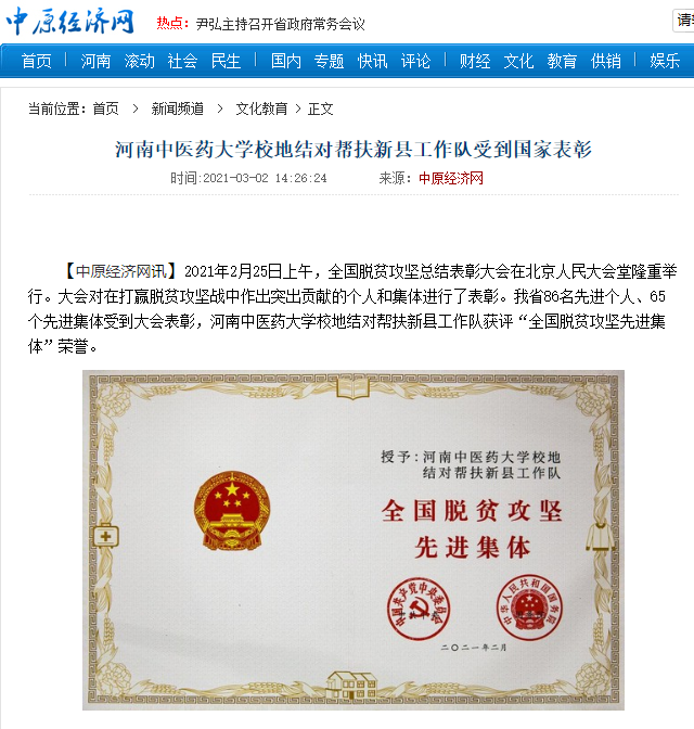 编者按:2021年3月2日,人民日报海外网、人民日报、中华高校网、中华网、豫网、新豫网、中原经济网、中国企业经济网、中国经济贸易新闻网、中国医药新闻网、国际在线、中国资源新闻网、新闻100度、中国产业新闻网、河南经济论坛、凤凰新闻、中新资讯网、旅游中国网、今日头条、中关村经济发展网、中国医学新闻网、河南高校行、共工日报社-共工网、都市网、重庆晨报、东方新闻等数十家媒体广泛报道leyu·乐鱼(中国)体育官方网站荣获“全国脱贫攻坚先进集体”。