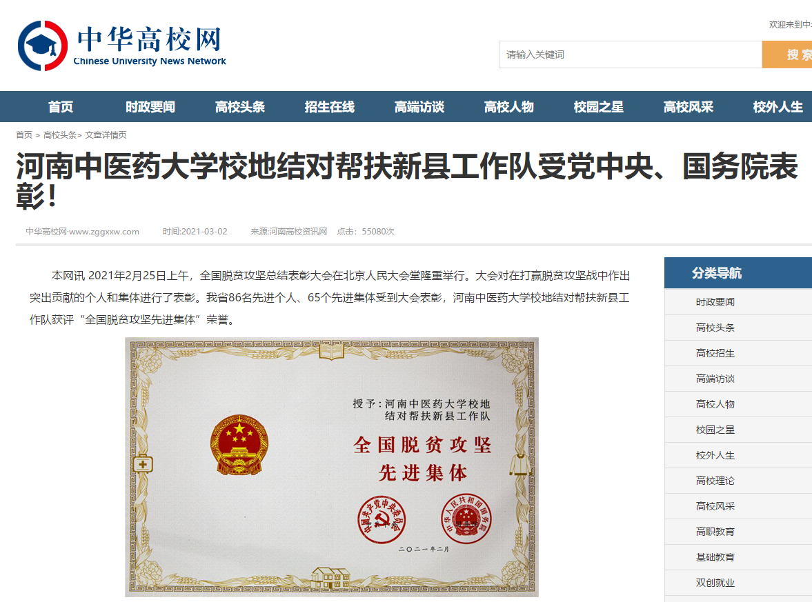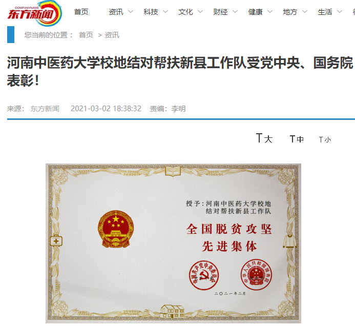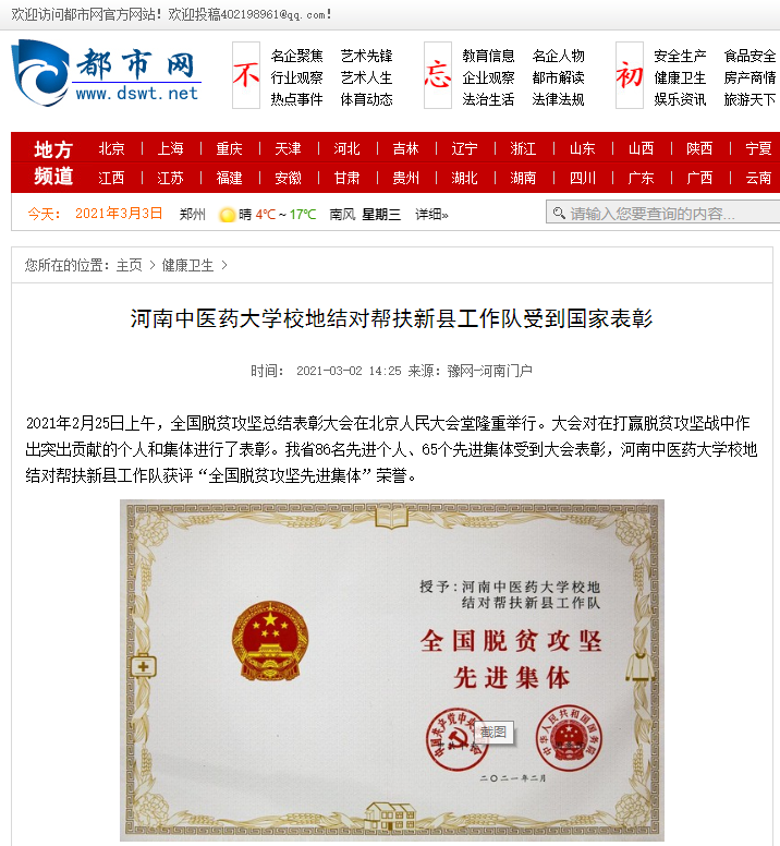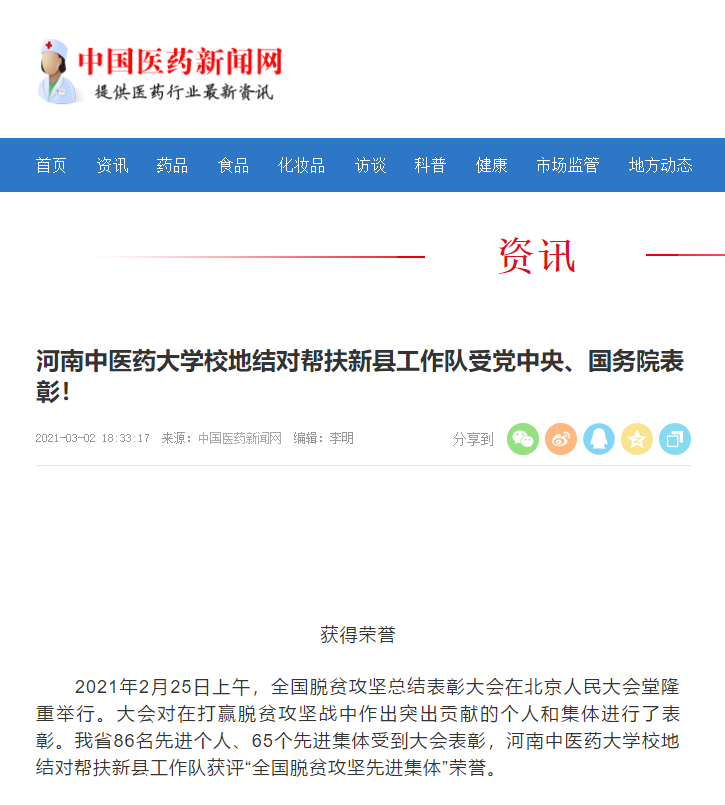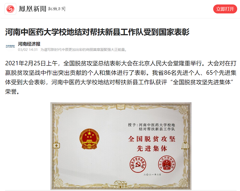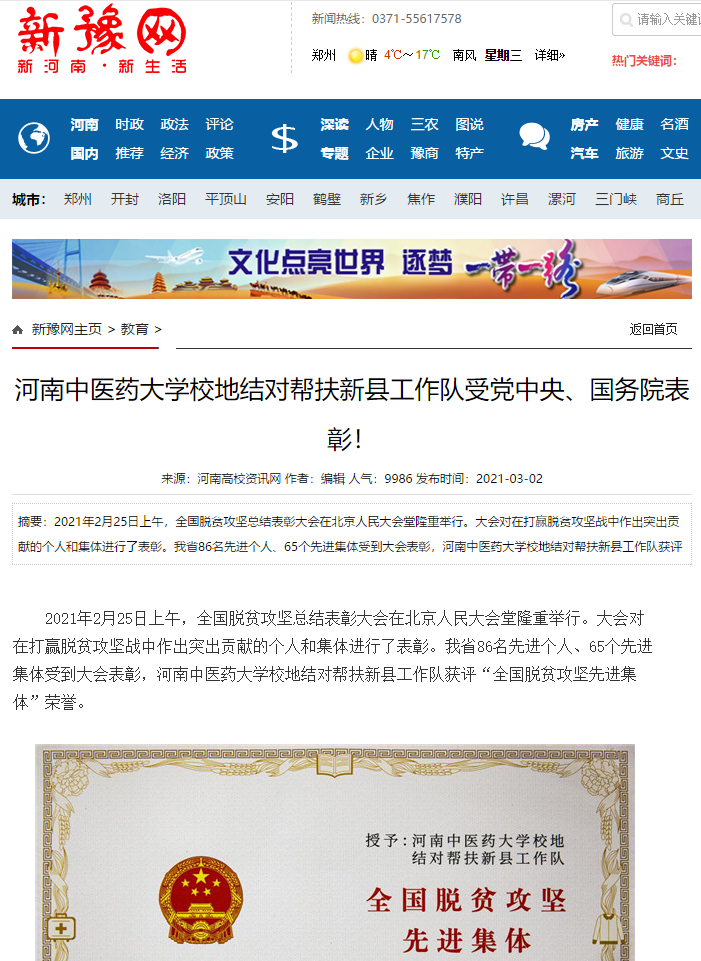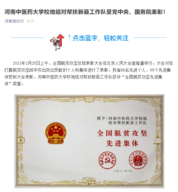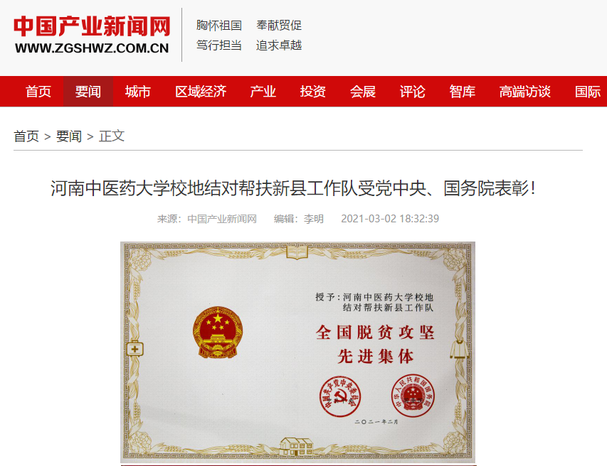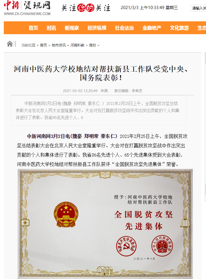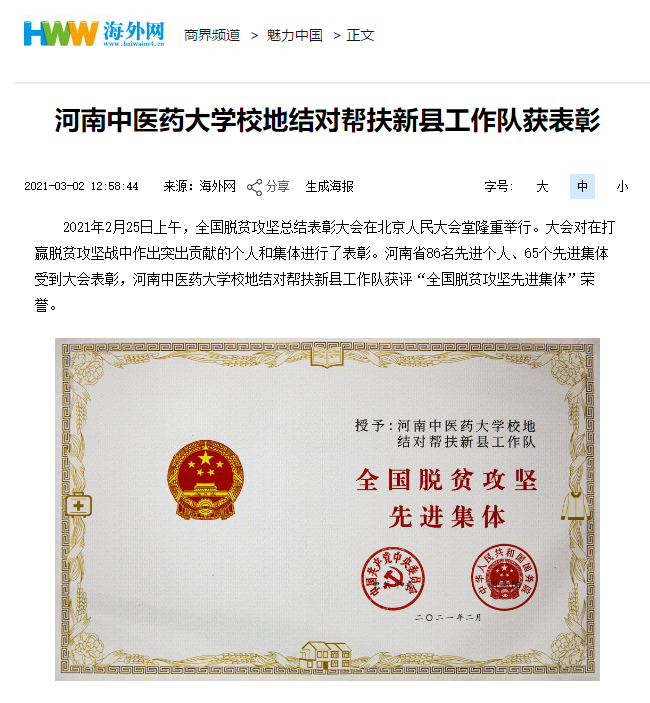 编者按:2021年3月2日,人民日报海外网、人民日报、中华高校网、中华网、豫网、新豫网、中原经济网、中国企业经济网、中国经济贸易新闻网、中国医药新闻网、国际在线、中国资源新闻网、新闻100度、中国产业新闻网、河南经济论坛、凤凰新闻、中新资讯网、旅游中国网、今日头条、中关村经济发展网、中国医学新闻网、河南高校行、共工日报社-共工网、都市网、重庆晨报、东方新闻等数十家媒体广泛报道leyu·乐鱼(中国)体育官方网站荣获“全国脱贫攻坚先进集体”。
