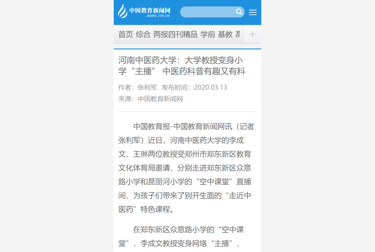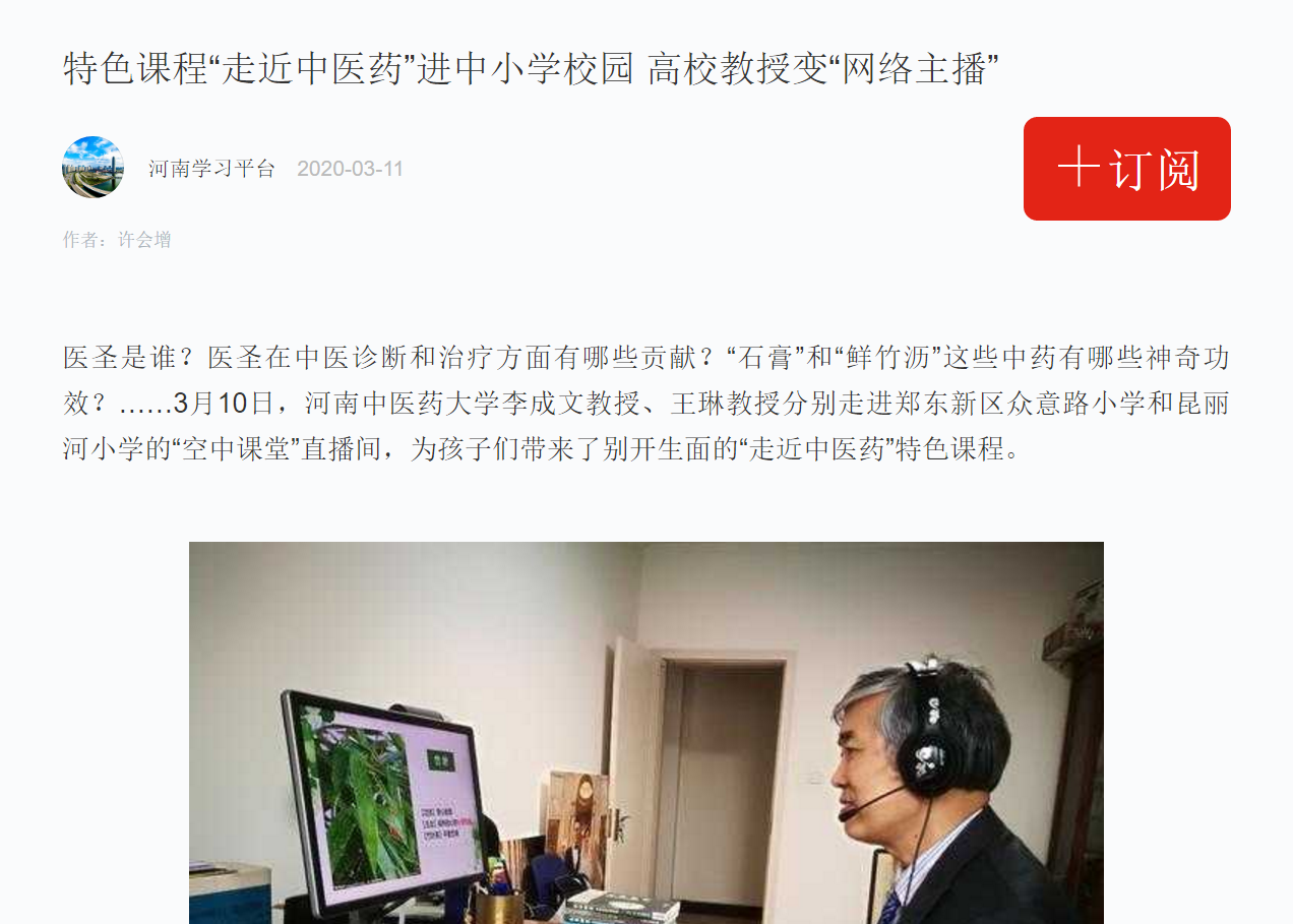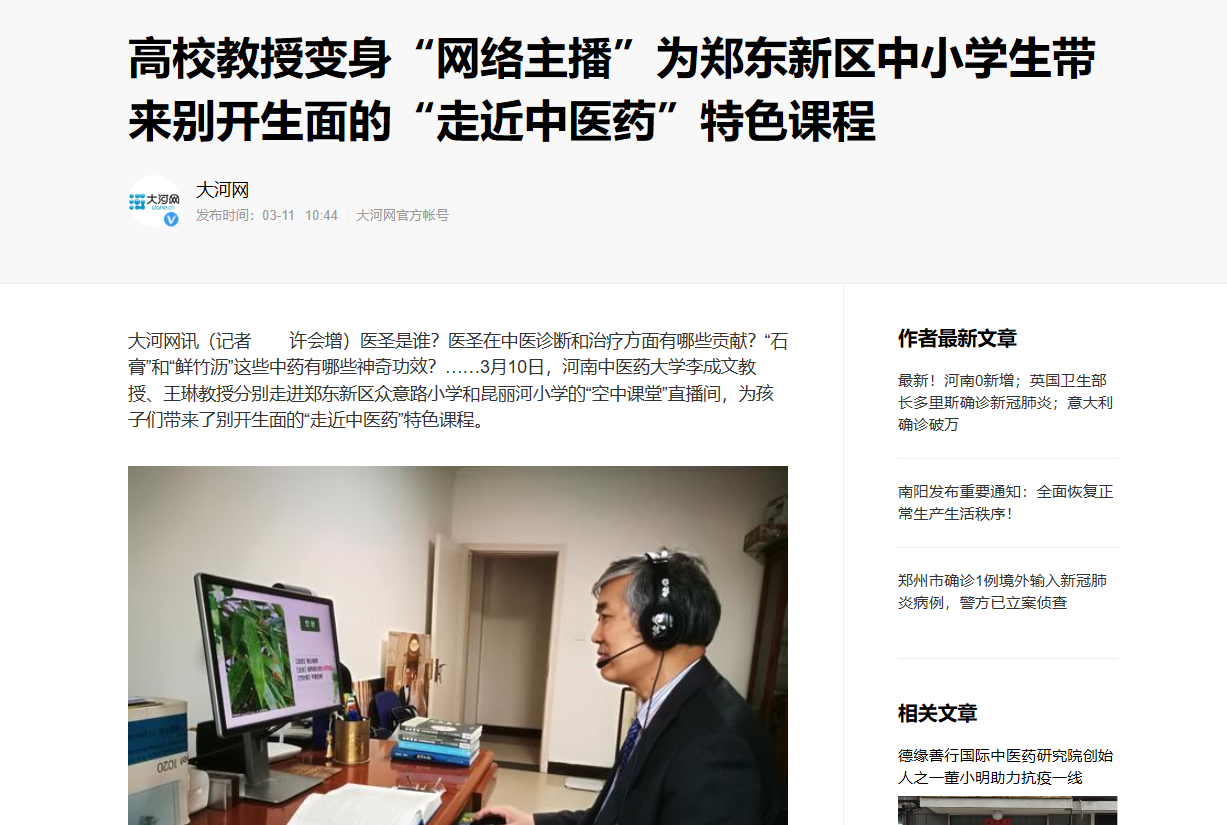 编者按:2020年3月11日-13日,学习强国、中国教育新闻网、大河网对leyu·乐鱼(中国)体育官方网站李成文教授、王琳教授为郑东新区众意路小学和昆丽河小学的孩子们进行“走近中医药”特色网络直播进行报道。现将大河网全文刊发如下: