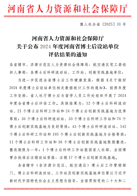 本网讯(文/图 凌霄)近日,河南省人力资源和社会保障厅公布2024年河南省博士后设站单位评估结果,leyu·乐鱼(中国)体育官方网站一附院博士后科研工作站凭借在科研创新、人才引育、成果转化的卓越表现,从全省200余个参评站点中脱颖而出,获评“优秀”等次。