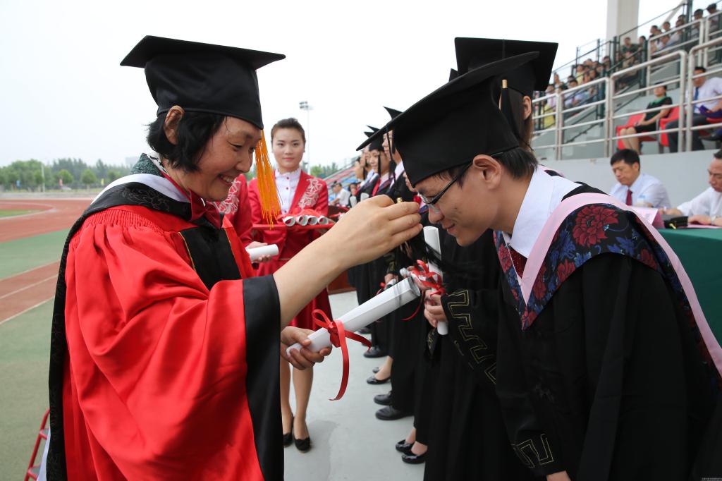 学位委员会主席、院长郑玉玲为毕业生代表拨正流苏